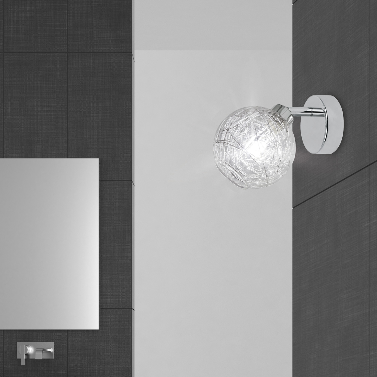 Foco / Aplique de pared de la Colección ROLO en acabado cromo. Fabricado en metal con tulipa de cristal y detalle decorativo en el interior de un hilo metálico. Usa bombillas G9 (no incluidas), compatibles con bombillas LED.Una amplia familia pen