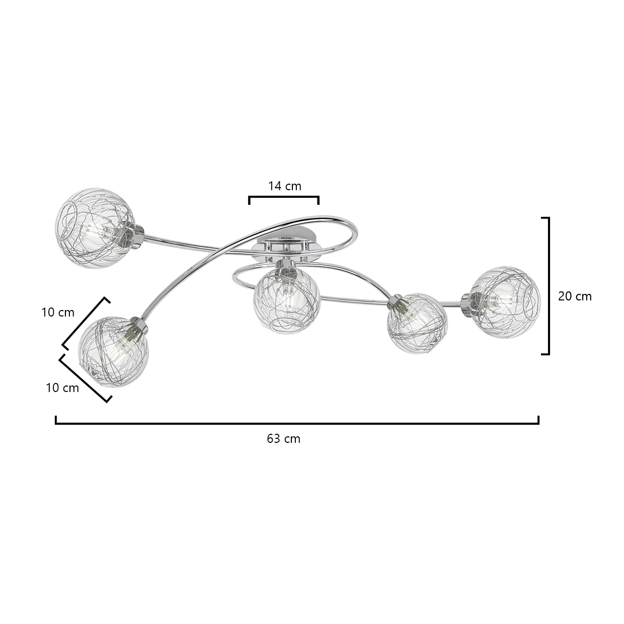 Lámpara/ semiplafón de 5 luces de la Colección ROLO en acabado cromo. Fabricado en metal con tulipa de cristal y detalle decorativo en el interior de un hilo metálico. Usa bombillas G9, 5 x G9 40W (no incluidas), compatibles con bombillas LED. Una