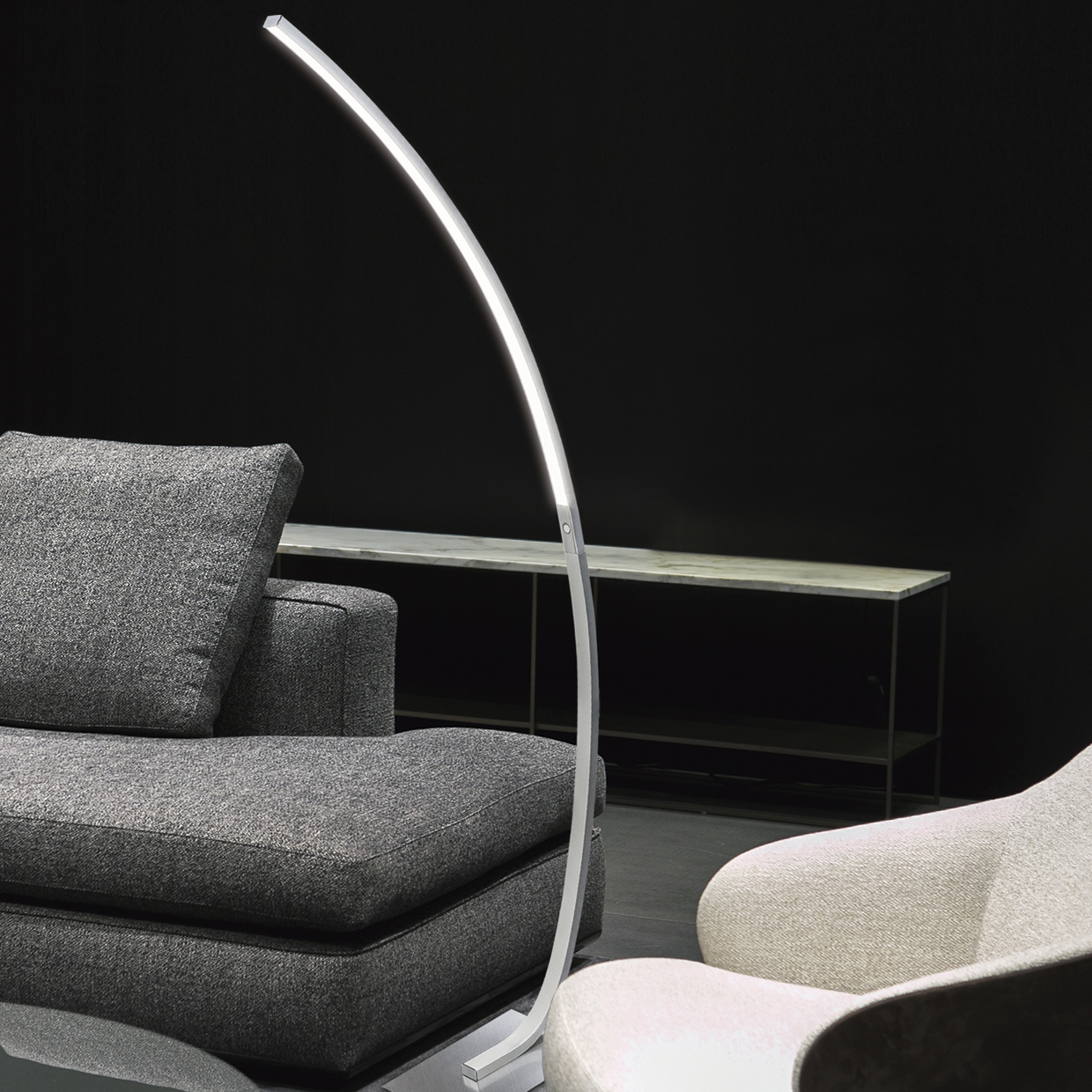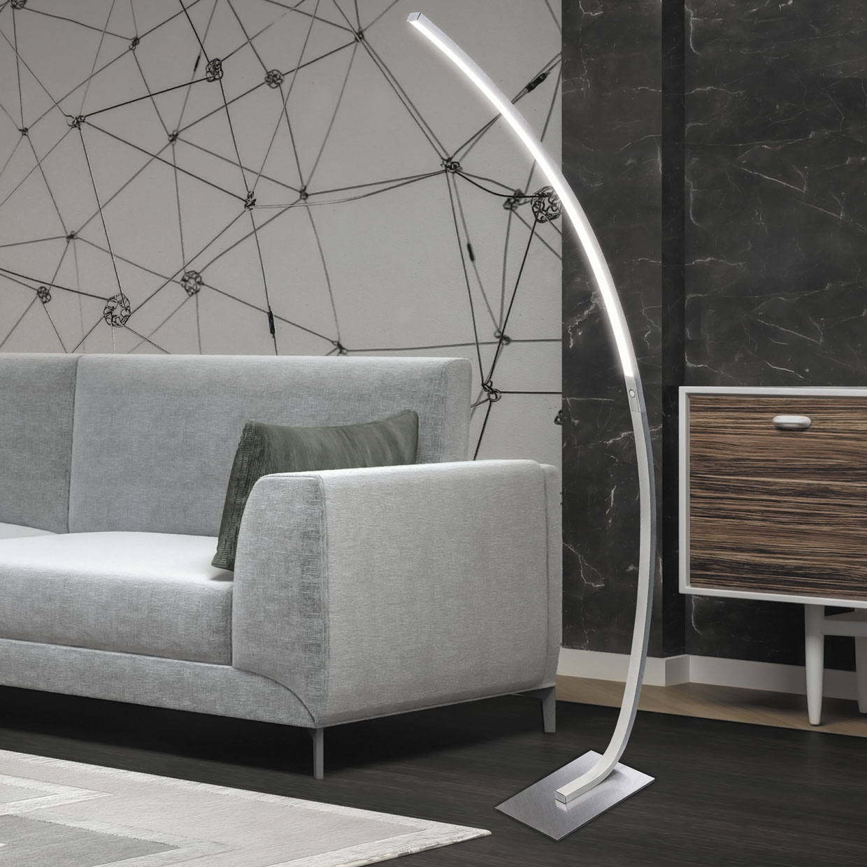 Lámpara de pie LED de la Colección Apolo. Fabricado en metal con acabado en níquel satinado, LED integrado, 25W 2000LM 4000K y regulable. Además de elegante y funcional, tiene un diseño estilizado con estructura curva que nos recuerda a un arco. Id