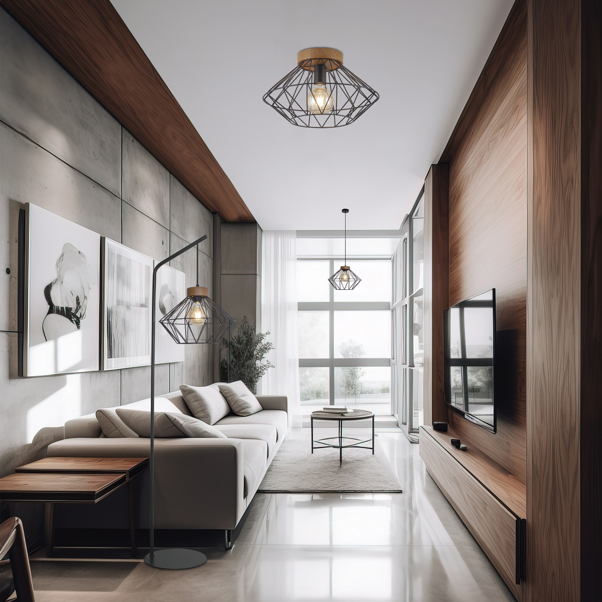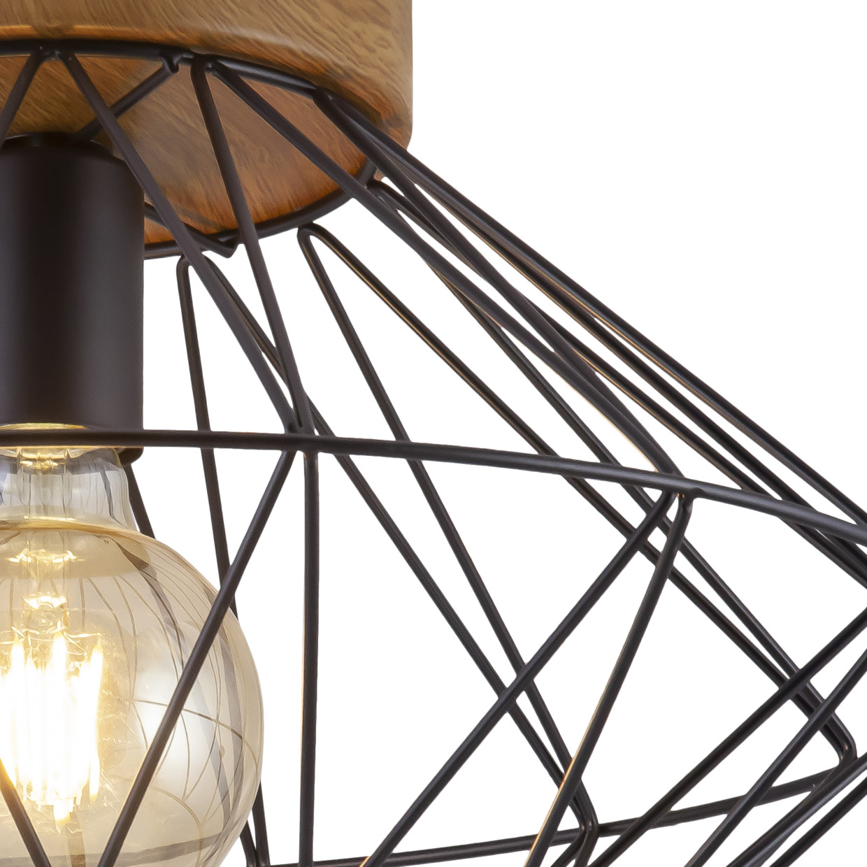 Plafón de la Colección ANTIBES, fabricada en metal, con acabado en negro y madera. Una familia de inspiración vintage. Formas geométricas y simétricas como línea argumental, en la búsqueda de la luminaria perfecta y equilibrada. En la que el contrast