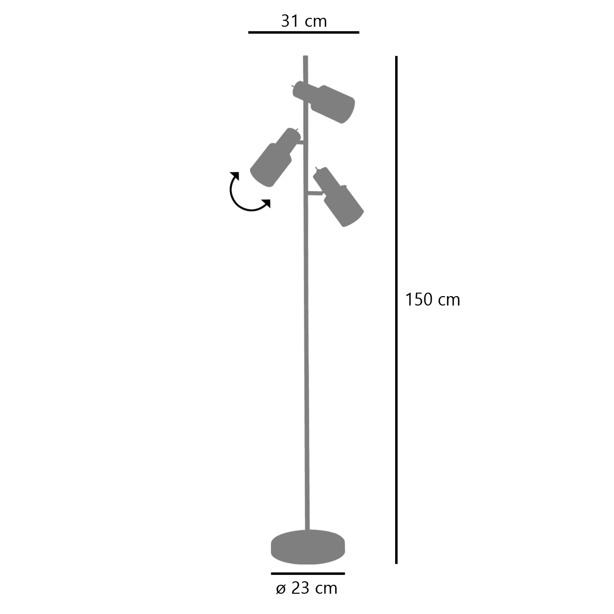 Lámpara de pie / Pie de salón de la Colección Maena. Fabricado en metal, acabado en negro y latón, dispone de 3 cabezales orientables e interruptor ON/OFF en cada cabezal. Usa bombillas E-14, 3 x E-14 40W Max., compatibles con bombillas LED (no inclu