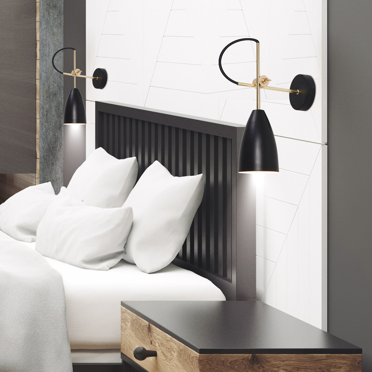 Aplique de la Colección MANUS fabricado en metal, en acabado negro y latón. Usa bombillas E-27 (no incluidas) compatibles con bombillas Led. Cabezal orientable y sin interruptor. Elegancia y sobriedad, dos de las características que definen a esta