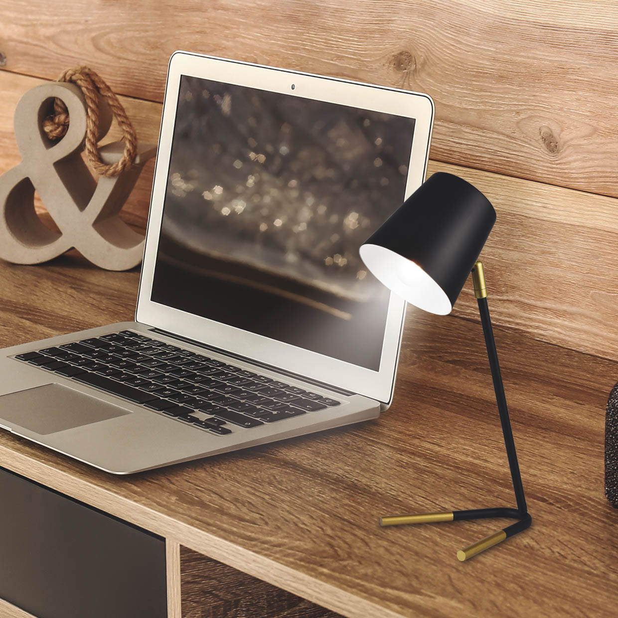 Lámpara de sobremesa de la Colección Dimas. Fabricado en metal, en acabado negro y detalles en dorado. Cabezal orientable. Usa bombilla E27, compatibles con tecnología Led (no incluida) 1 x E-27 60W Max. Ideal para dormitorios y o como iluminación in