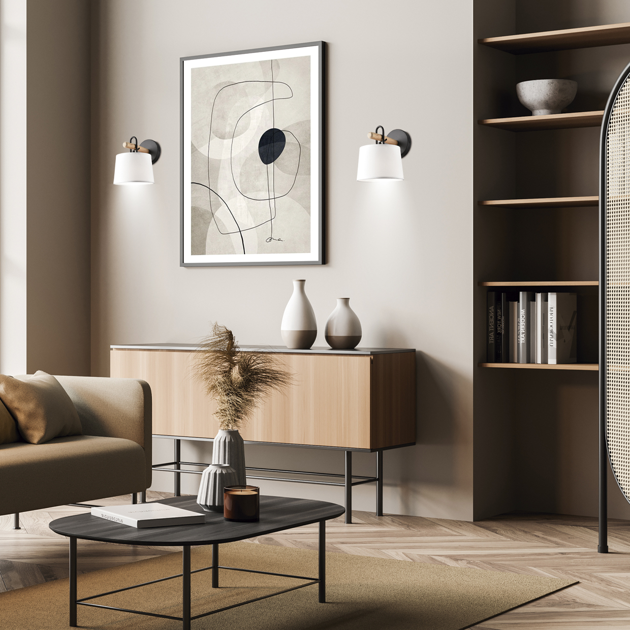 Lámpara / Aplique de pared de la Colección Arolas. Fabricado en metal negro con detalle de madera y pantalla de tela. Un guiño al estilo nórdico que harán las delicias de los amantes de esta tendencia, tan afianzada. Usa bombilla E27, 1 x E-27 60W Ma
