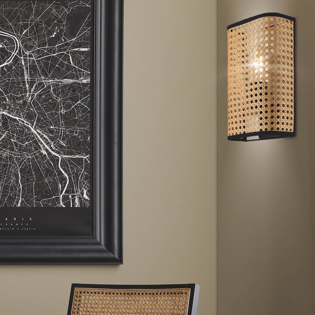 Lámpara / Aplique de pared de la Colección OYSTER, fabricado en rejilla. Esta exitosa malla está hecha de la parte exterior de la corteza de la caña de ratán. Es un material resistente y flexible que nos permite soñar y aplicarla de forma libre en la