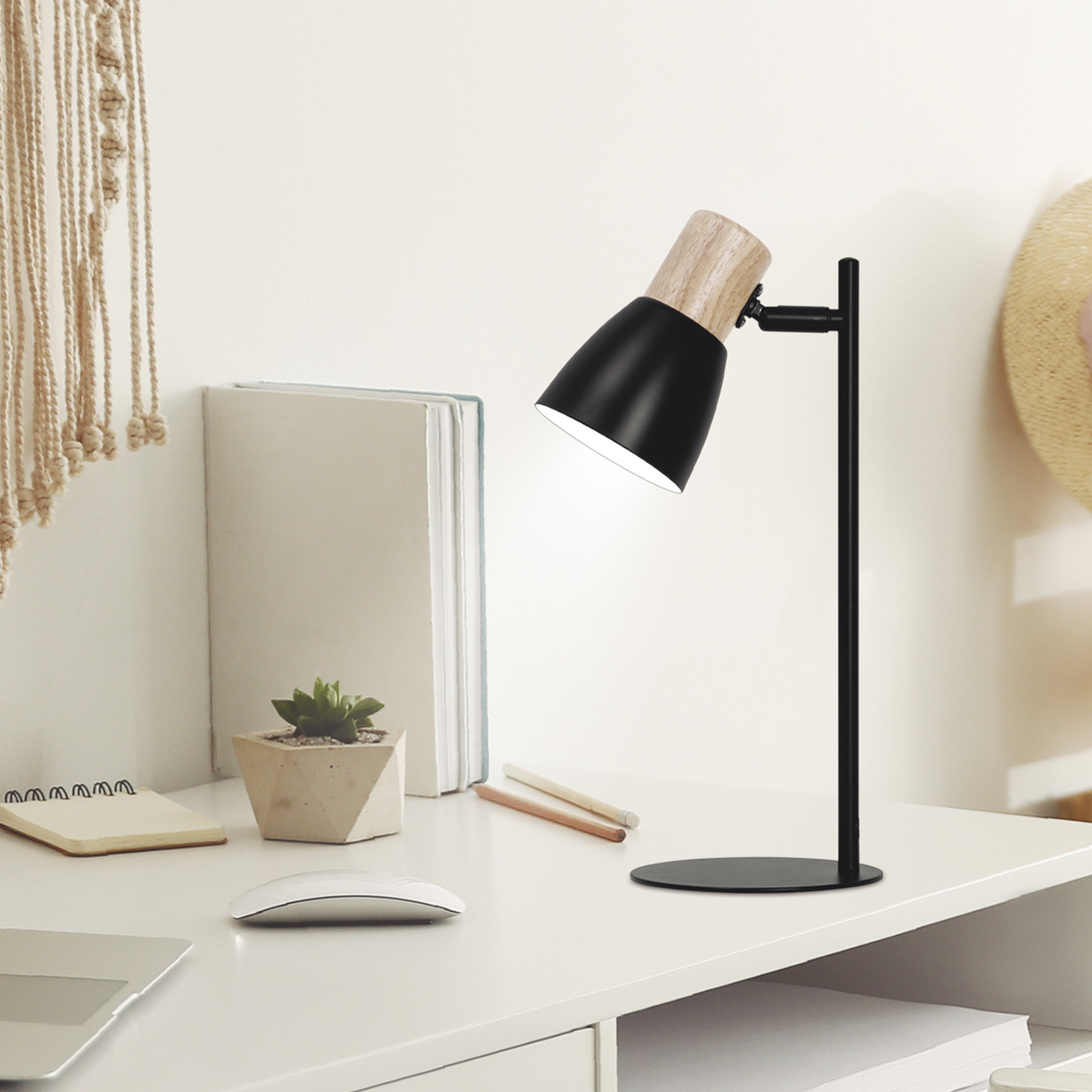 Lámpara de sobremesa de la Colección CABIN. Fabricado en metal en color negro y detalles de madera. Cabezal orientable y encendido ON/OFF en cable. Usa bombilla E27, 1 x E-27 60W Max. compatibles con tecnología Led (no incluida). Gracias a su atracti