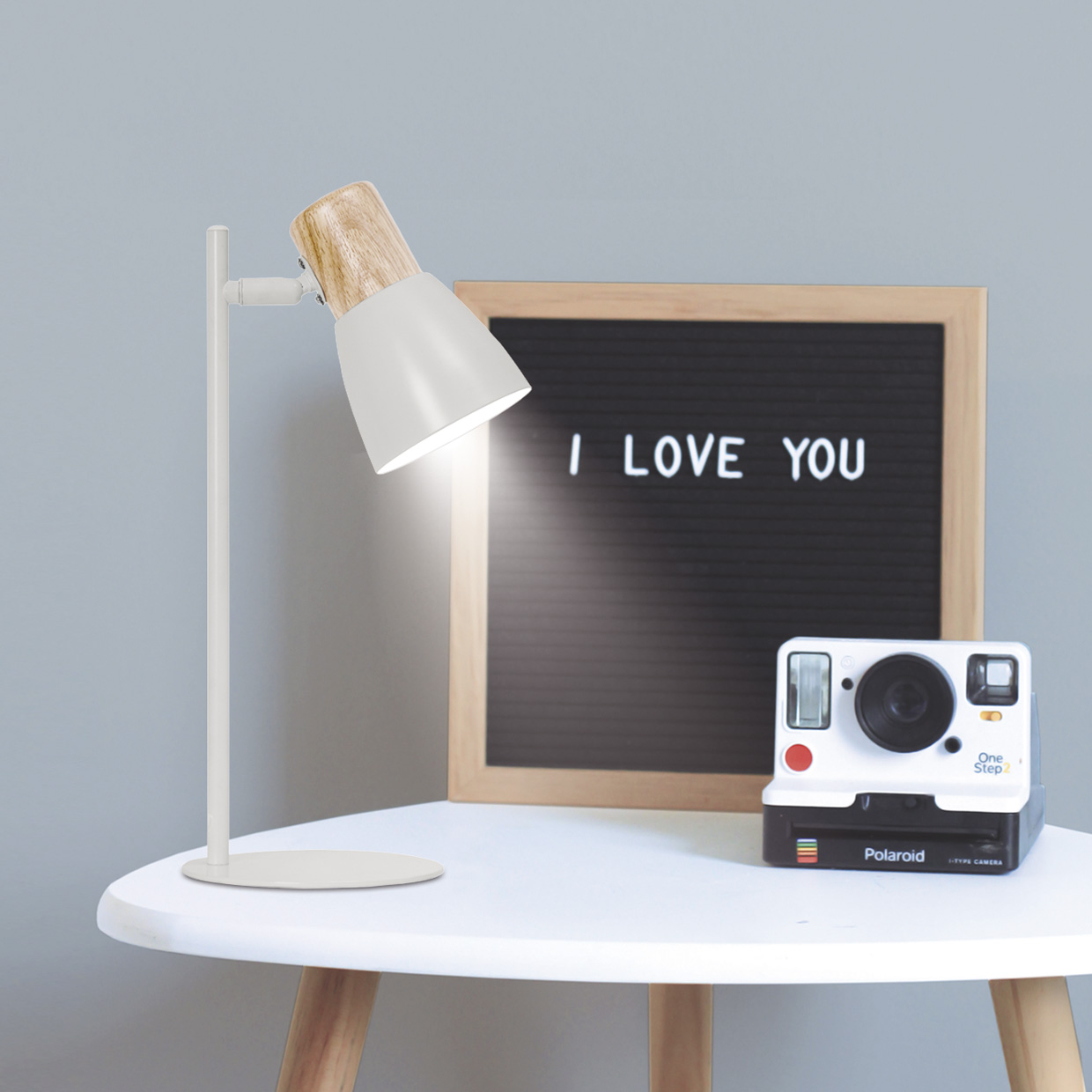 Lámpara de sobremesa de la Colección CABIN. Fabricado en metal en color blanco y detalles de madera. Cabezal orientable y encendido ON/OFF en cable. Usa bombilla E27, 1 x E-27 60W Max., compatibles con tecnología Led (no incluida). Gracias a su atrac