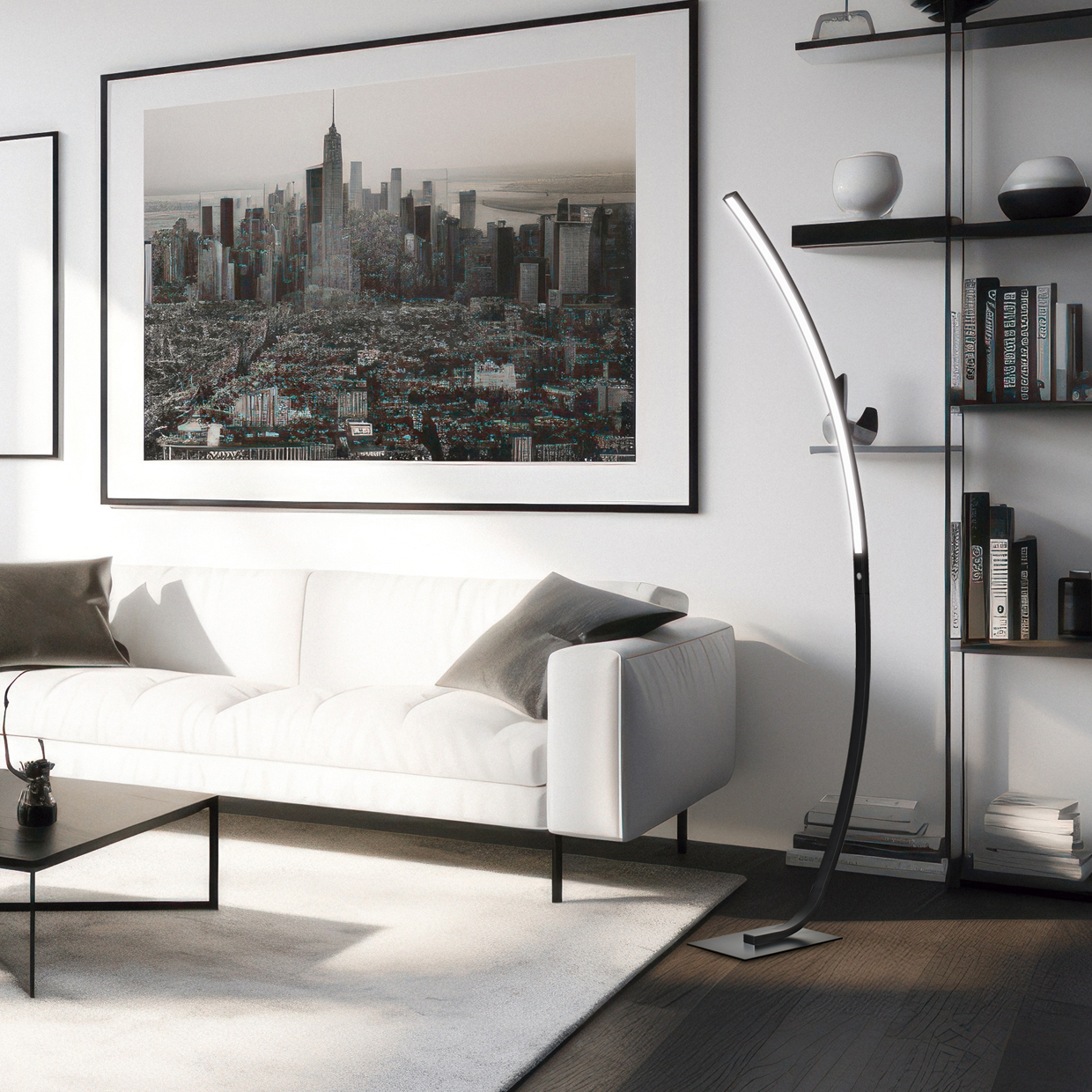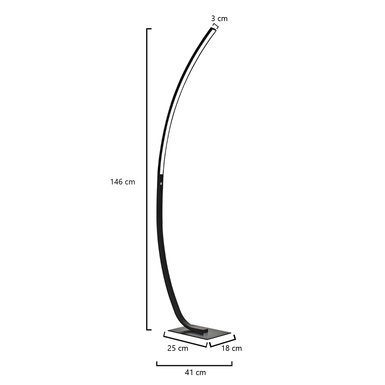 Lámpara de pie LED de la Colección Apolo. Fabricado en metal con acabado en negro, LED integrado y regulable. Además de elegante y funcional, tiene un diseño estilizado con estructura curva que nos recuerda a un arco. Ideal para iluminar a la vez q