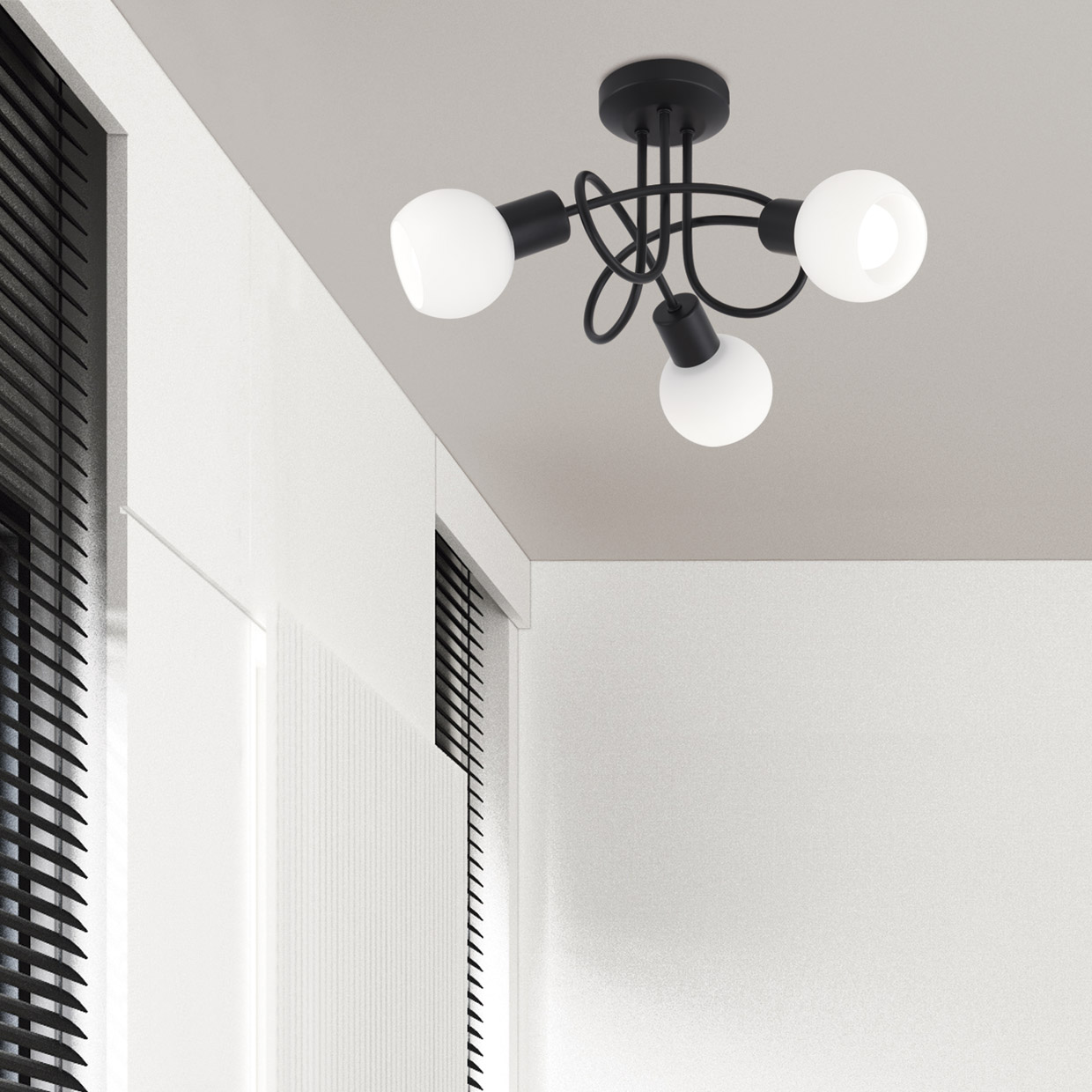 Lámpara / semiplafón de 3 luces de la Colección OPAL en acabado negro. Fabricado en metal con tulipa de cristal opal. Usa bombillas E-14 (no incluidas), compatibles con bombillas LED.Una amplia familia pensada para ambientes actuales y contemporáne