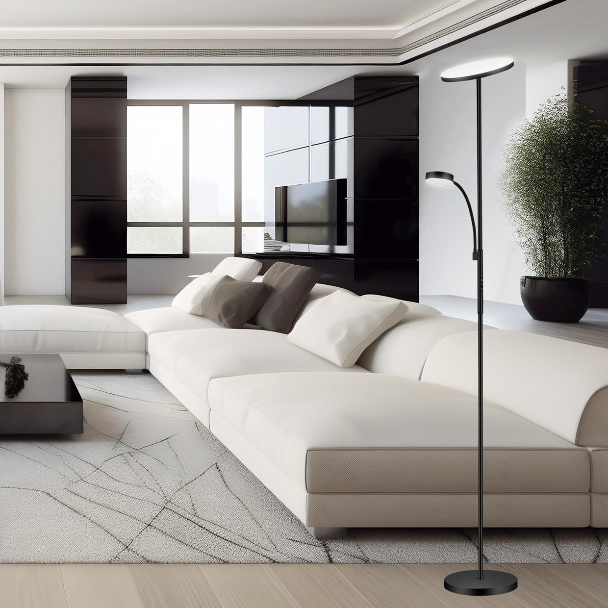 Pie salón de la colección ELTON. Fabricado en metal, en acabado negro con cubierta de cristal en la parte superior con medida: Ø 25×1,6cm. Led integrado 25W 2000LM 4000K.Cable PVC negro de 1,8mts. Dispone de doble interruptor táctil.Brazo lecto