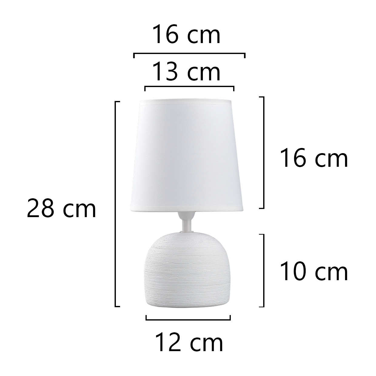 «Sobremesa de la Colección BAXTER en acabado ceramica Blanca, con pantalla de tela blanca de Ø16 cm.Usa bombilla E-14 / 40W (no incluida), compatible con bombillas LED.Cable PVC con interruptor ON/OFF.»