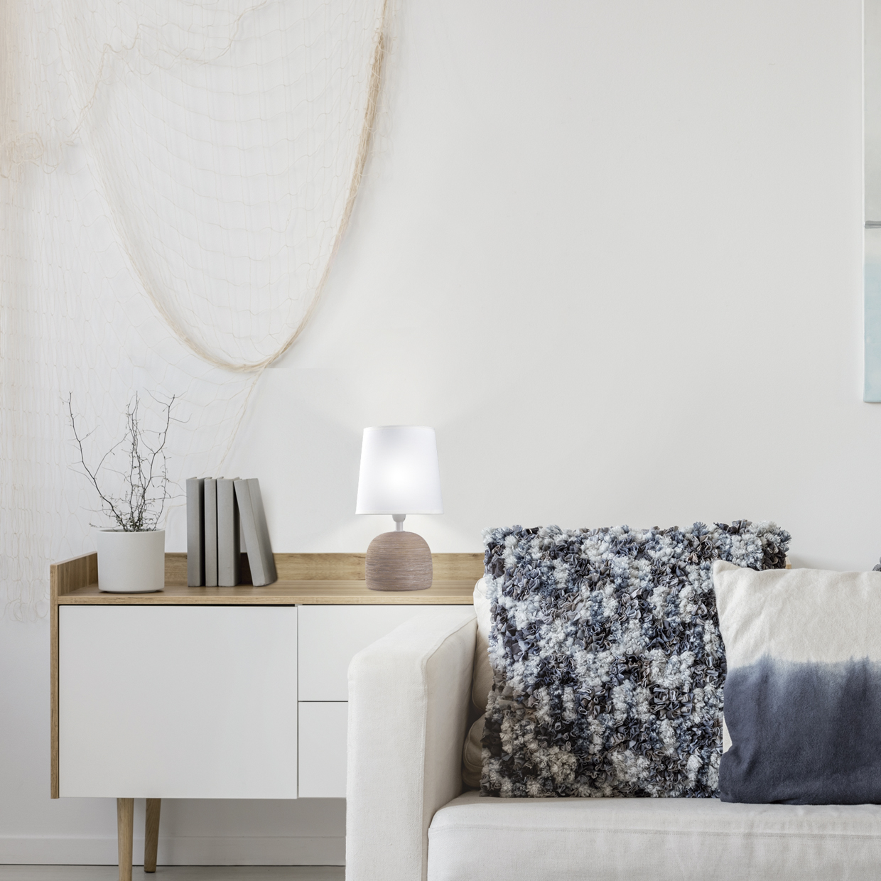 «Sobremesa de la Colección BAXTER en acabado ceramica Marrón, con pantalla de tela blanca de Ø16 cm.Usa bombilla E-14 / 40W (no incluida), compatible con bombillas LED.Cable PVC con interruptor ON/OFF.»