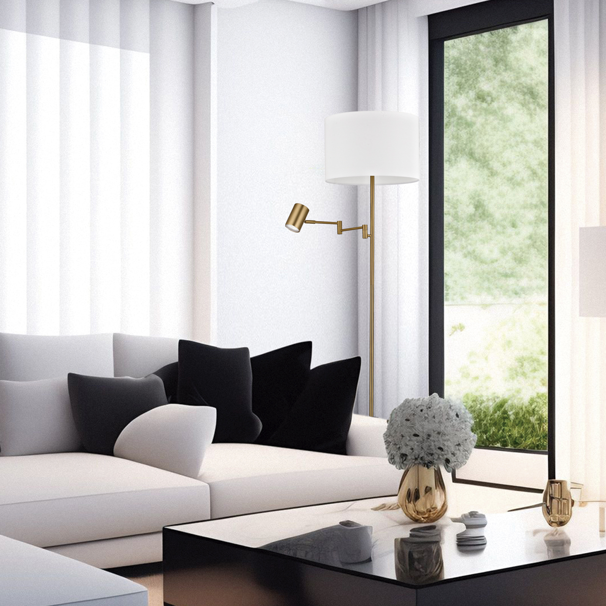 Lámpara de pie / Pie de salón de la colección BARACK. Fabricado en metal, en acabado latón con brazo articulado y pantalla superior cilíndrica de tela. Cabezal orientable con encendido independiente. Usa bombilla E-27 + GU-10, 1 x E-27 60W Max. + 1 x