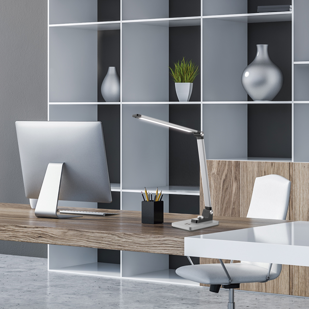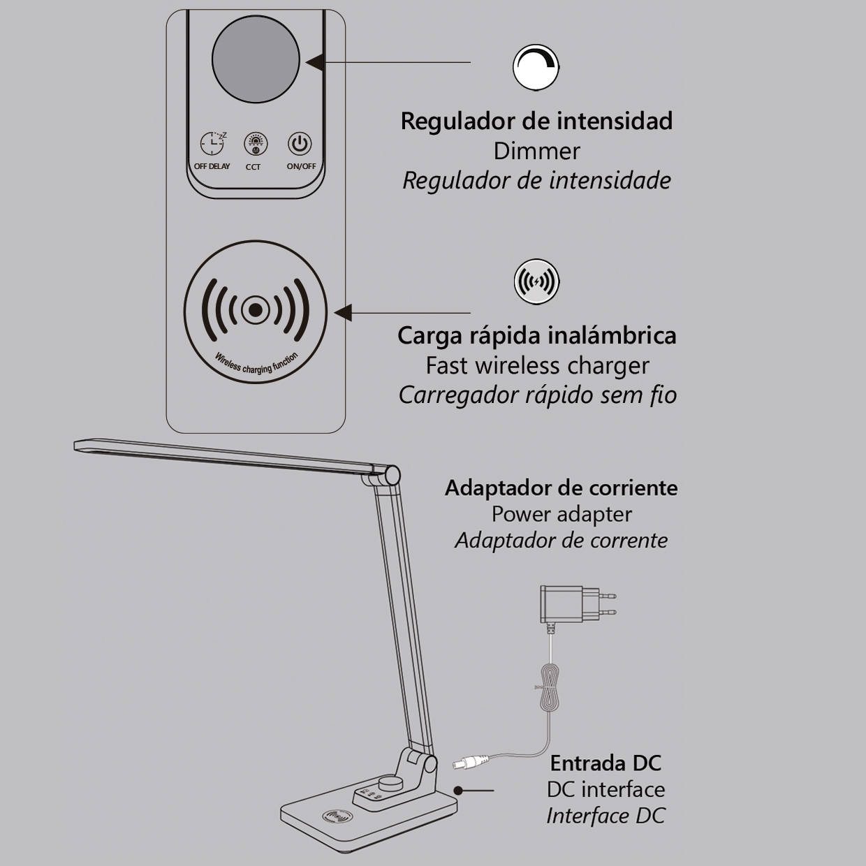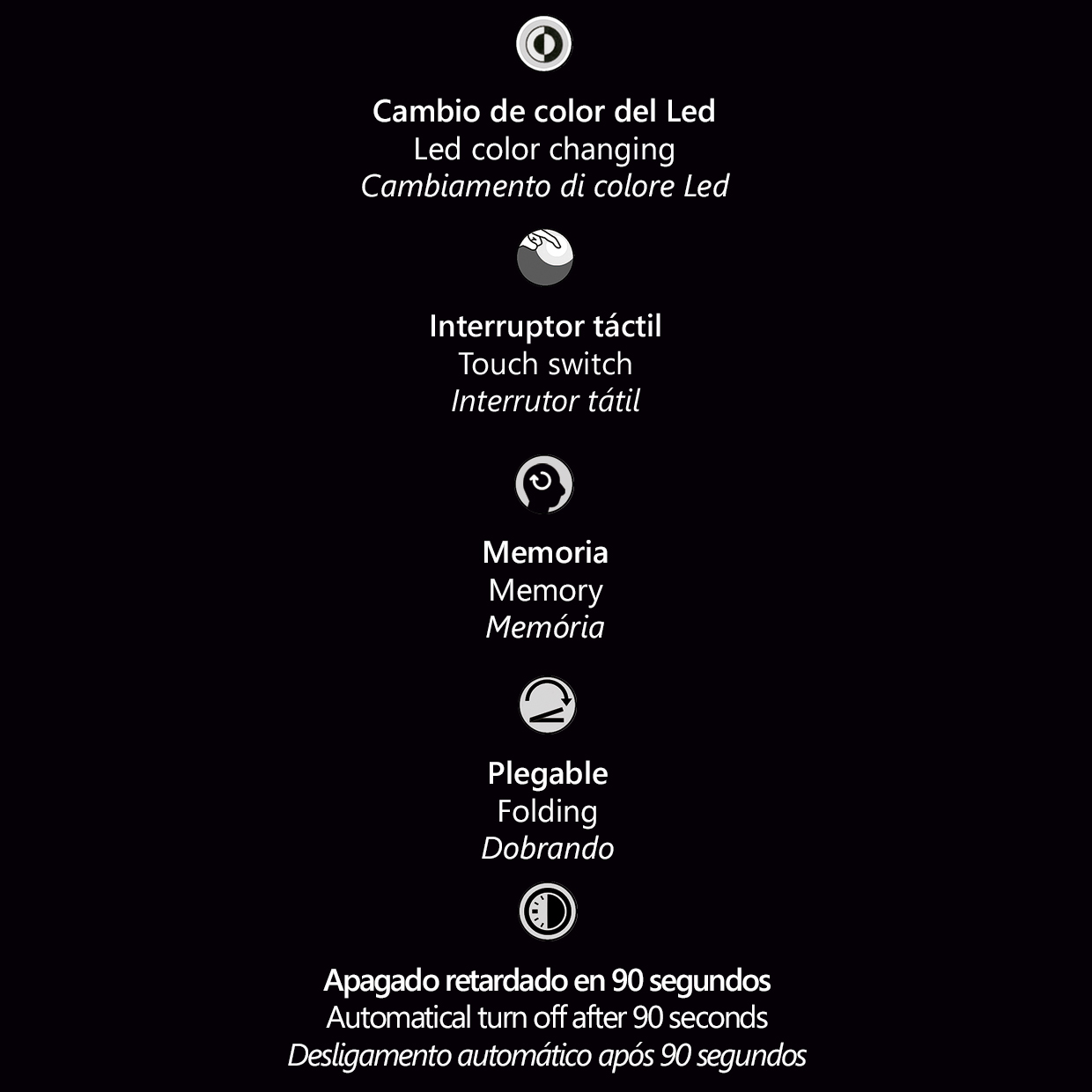 Interruptor táctil On/Off.Totalmente plegable y multitud de posiciones disponibles.Regulador de intensidad rotatorio.Cambio de temperatura del color (3000-4000-6500 ºK).Panel lateral anti deslumbre.Carga inalámbrica rápida.Función apagado