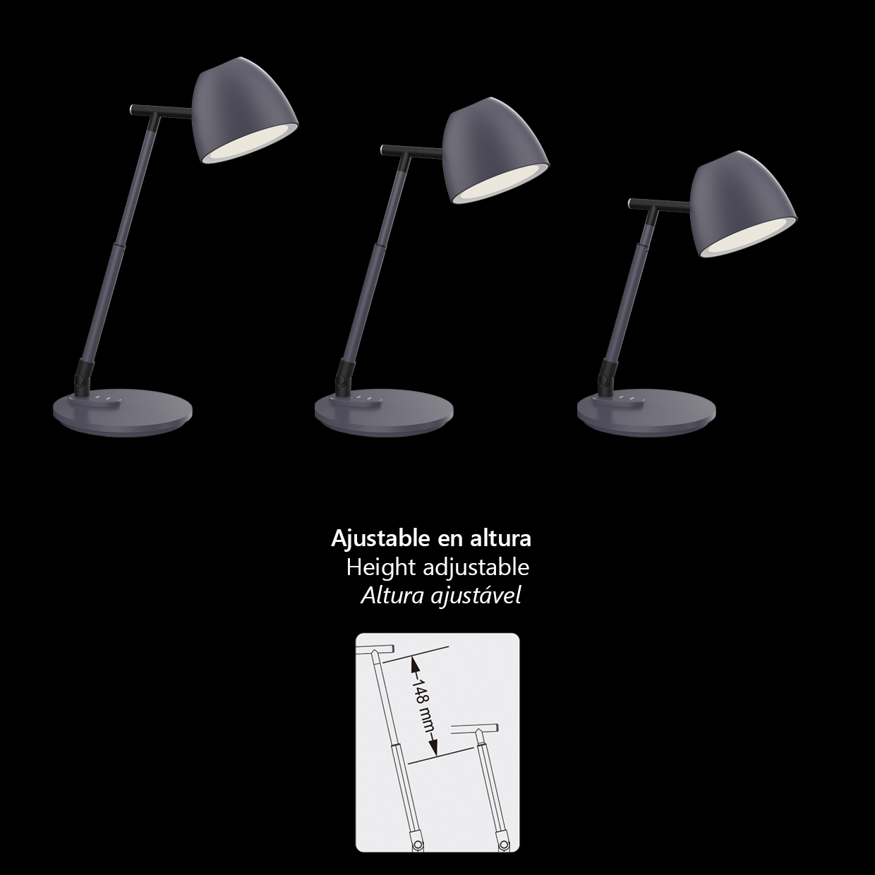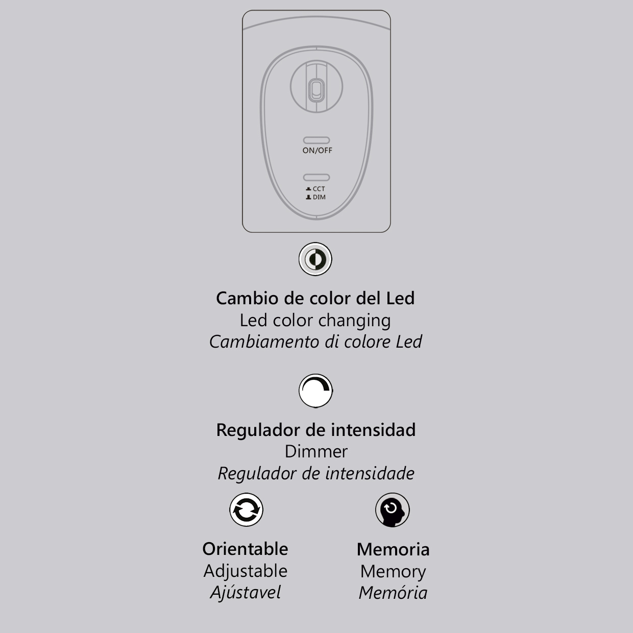 Interruptor táctil On/Off.Cabezal orientable (hasta 76º).Brazo extensible, máximo 110 mm. y posibilidad de rotación hasta 45º.Regulador de intensidad, en interruptor de encendido mediante pulsación. Pulsación corta, cambio de color y pulsación