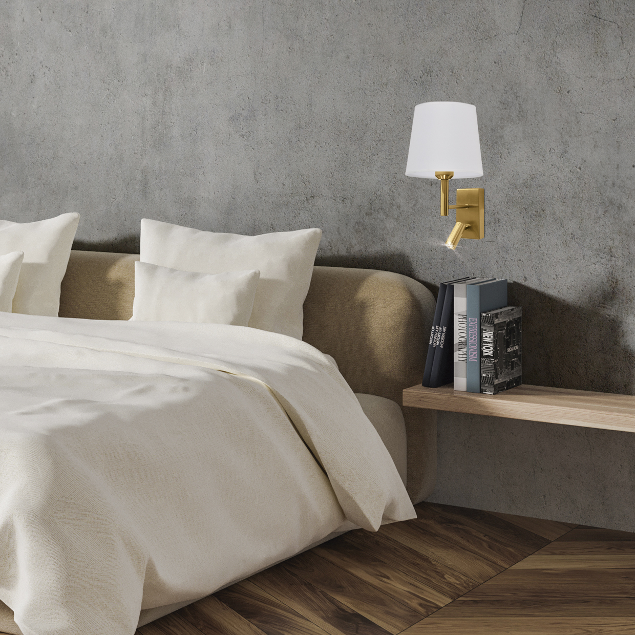 Aplique / Lámpara de pared de la Colección ARLA, fabricado en metal en acabado latón y pantalla de tela. Una moderna y elegante propuesta que nos enamora. Con doble encendido, dispone de dos puntos de luz, uno superior de E-27 y un lector orientable