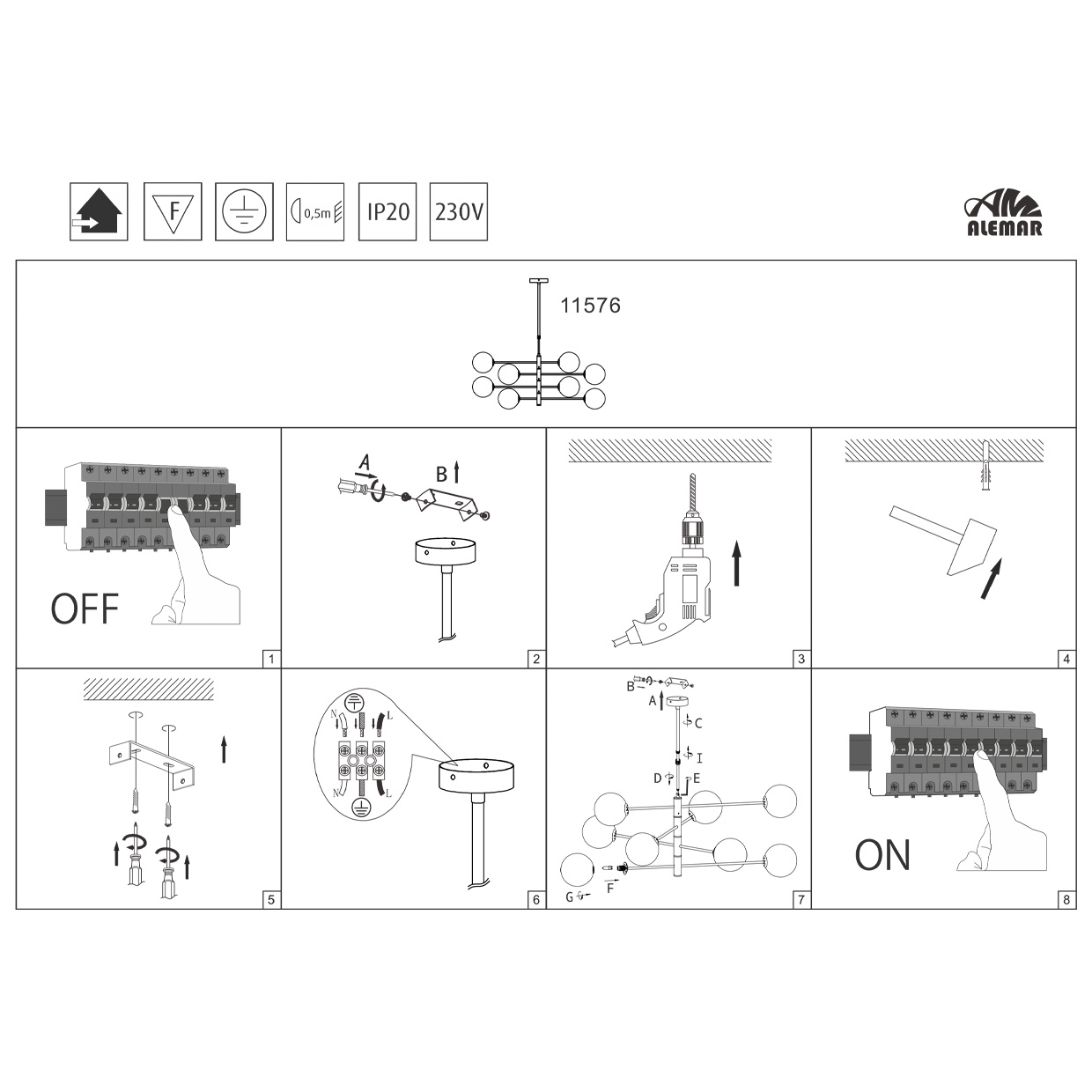 Diametro tulipas 8 x Ø14cmEAN: 8435045000166Peso: 4.24 KgMedidas: 85x85x78Potencia: 8 X 28WMaterial: METAL/CRISTALColeccion: GALAXIAColor: LATÓNPortalámparas: G-9Marca: ALEMAR