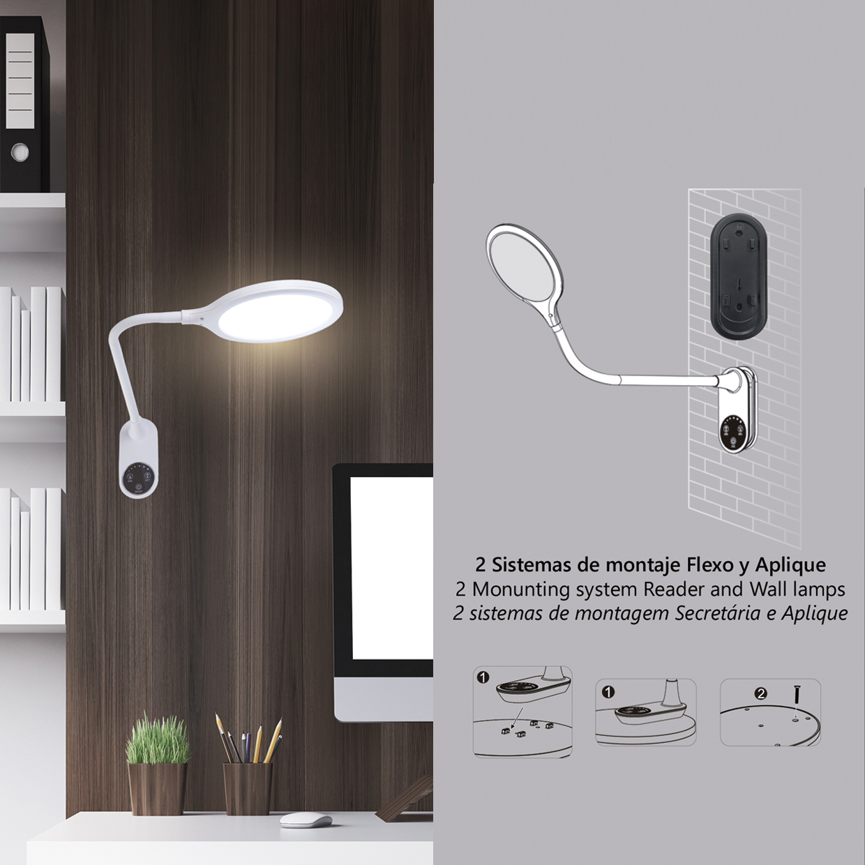 Regulador de intensidadCambio de color del LedInterruptor táctilMemoriaNO batería recargable2 Sistemas de montaje Flexo y Aplique.