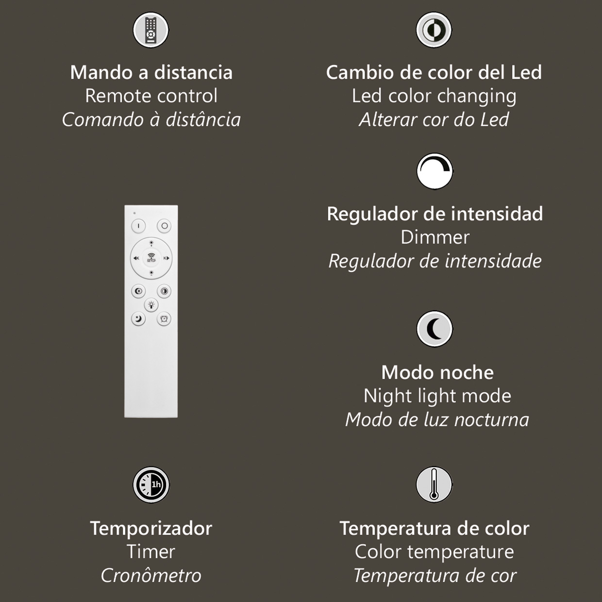 Plafón Led de la Colección NIRO (62W). Fabricado en metal en acabado blanco con difusor en metacrilato. Led integrado CON regulador de intensidad, cambio de temperatura de color, temporizador y modo noche. Incluye mando a distancia. LED 62W 2524LM 30