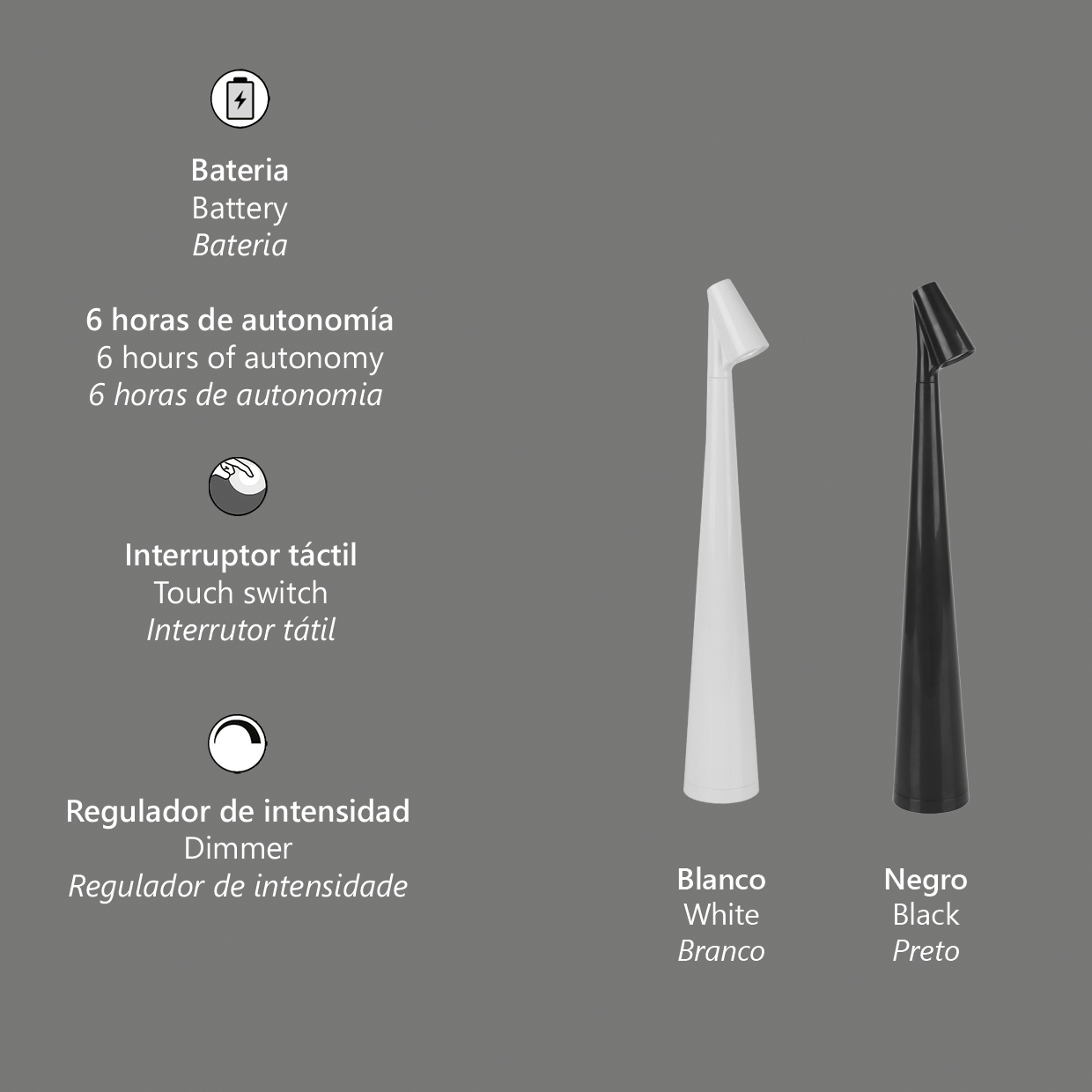 Lámpara recargable.Bateria: 6 horas de autonomniaInterruptor táctil On/Off en la base.Intensidad de la luz regulable.