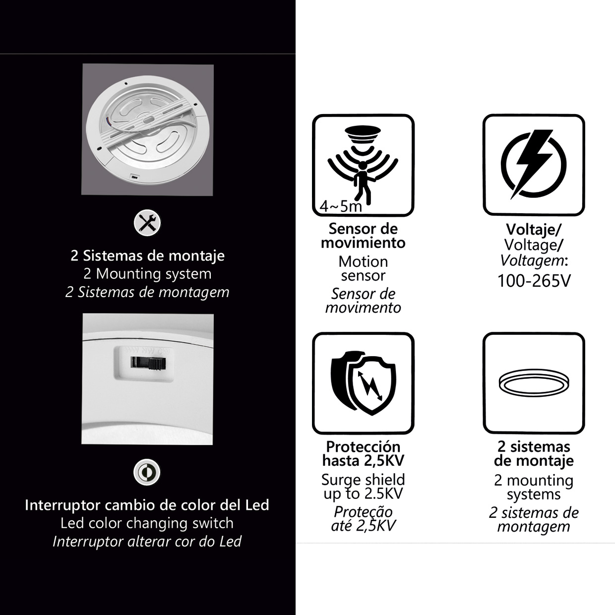 Plafón Led de la Colección Dago (18W). Fabricado en metal en acabado blanco y metacrilato. Led integrado 18W 1440LM 3000-4000-6500K. Sólo para superficie.Interruptor de cambio de color del led. Sensor de movimiento.Un diseño sencillo y moderno pa