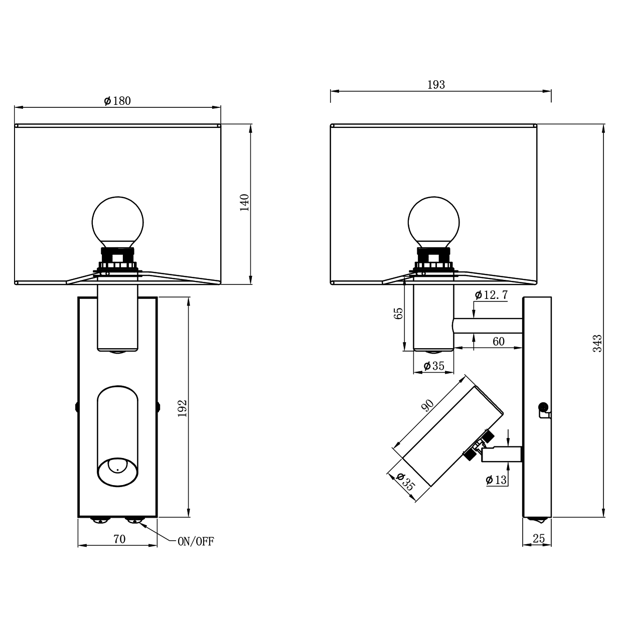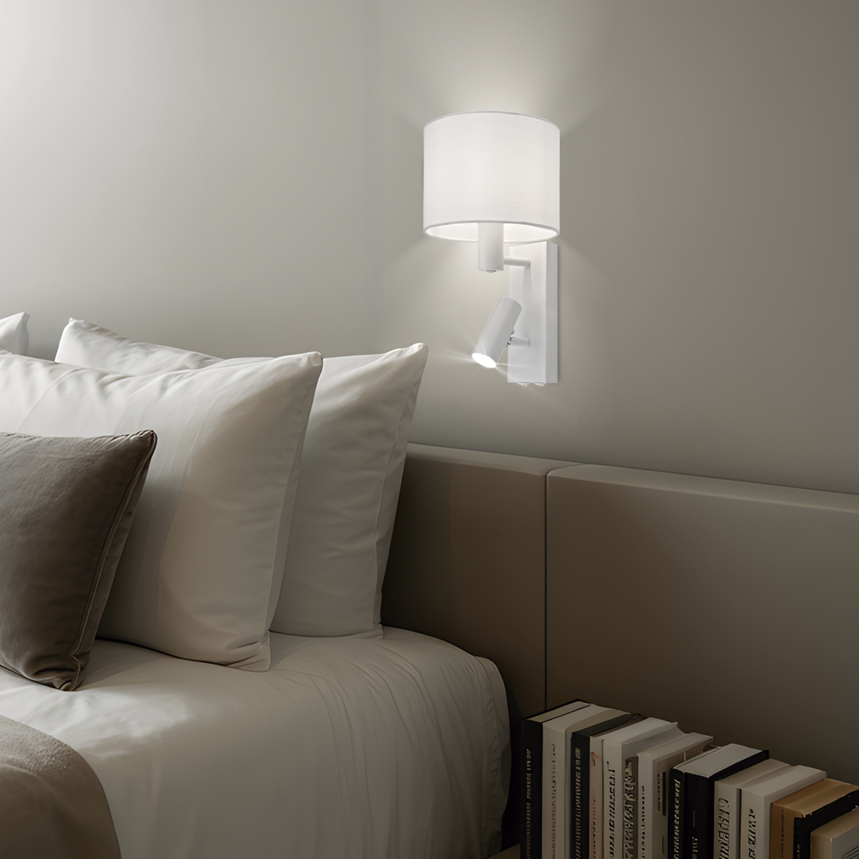 Aplique de la COLECCIÓN HERA, fabricado en metal Blanco con pantalla textil blanca.Pantalla: Ø18 cmLector orientable: 9 x 3,5 cmBase: 7 x 2,5 x 19,2 cmDoble interruptor ON/OFF con botón en la base.1 x E-14 / 40W (no incluida) y 1 x G-9