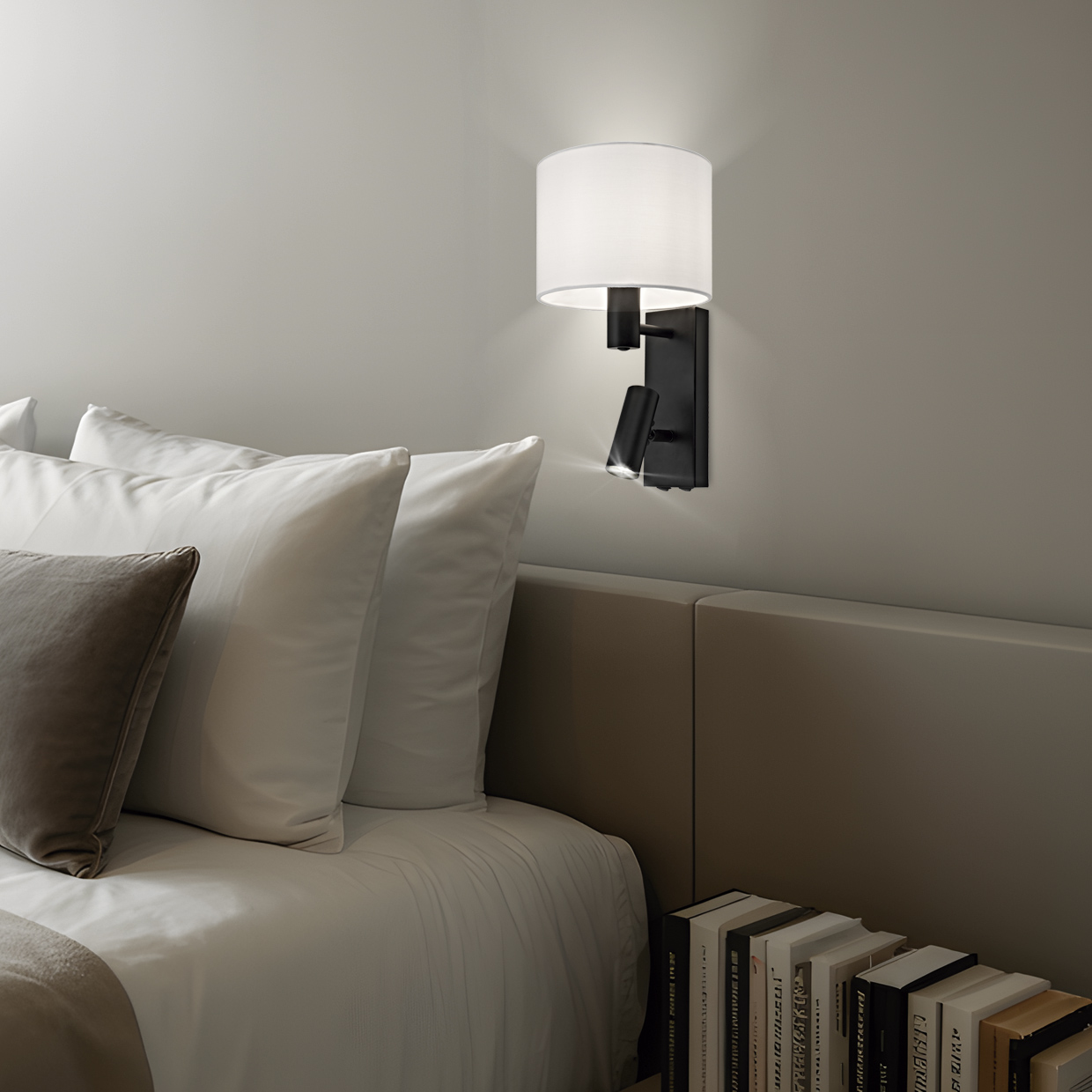 Aplique de la COLECCIÓN HERA, fabricado en metal Negro con pantalla textil blanca.Pantalla: Ø18 cmLector orientable: 9 x 3,5 cmBase: 7 x 2,5 x 19,2 cmDoble interruptor ON/OFF con botón en la base.1 x E-14 / 40W (no incluida) y 1 x G-9 /