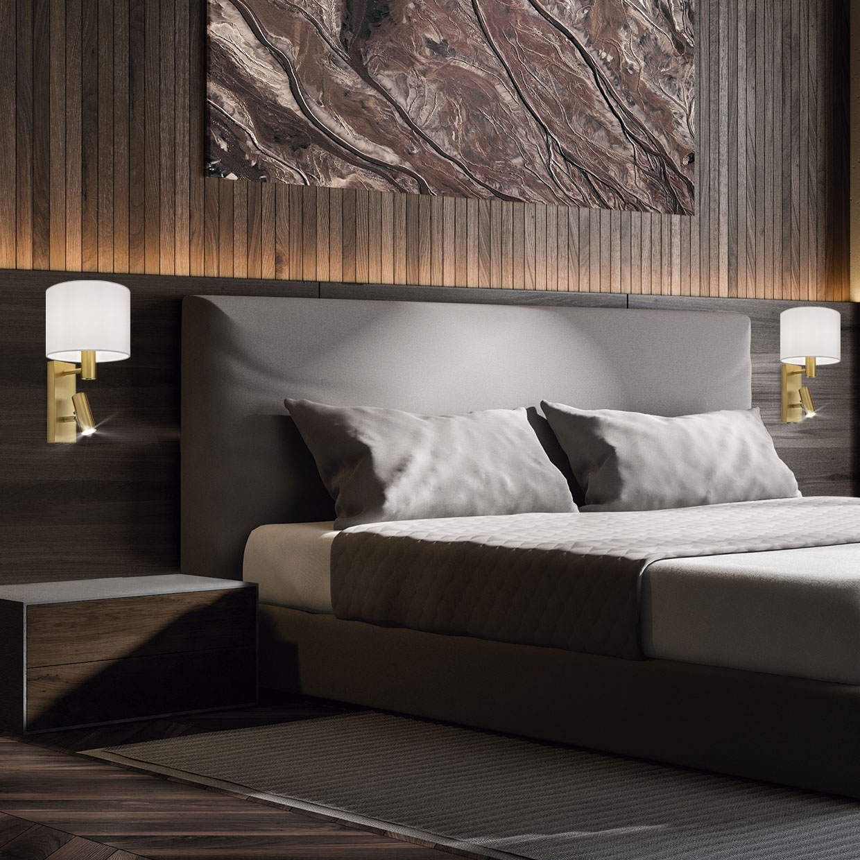 Aplique de la COLECCIÓN HERA, fabricado en metal Latón con pantalla textil blanca.Pantalla: Ø18 cmLector orientable: 9 x 3,5 cmBase: 7 x 2,5 x 19,2 cmDoble interruptor ON/OFF con botón en la base.1 x E-14 / 40W (no incluida) y 1 x G-9 /
