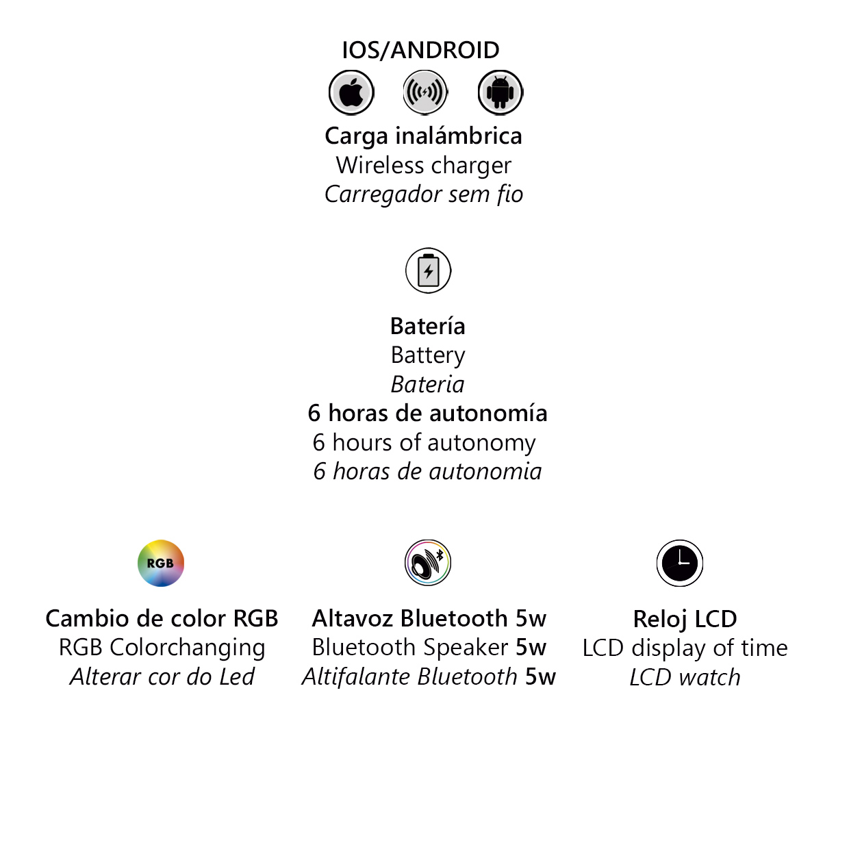 Lámpara de sobremesa LED y cargador inalámbrico de la Colección Bolt, fabricada en acrílico con acabado en Blanco.Un gadget versátil que combina iluminación, sonido y carga en un mismo diseño:- No dimable- Luz RGB de alta luminosidad- Cua