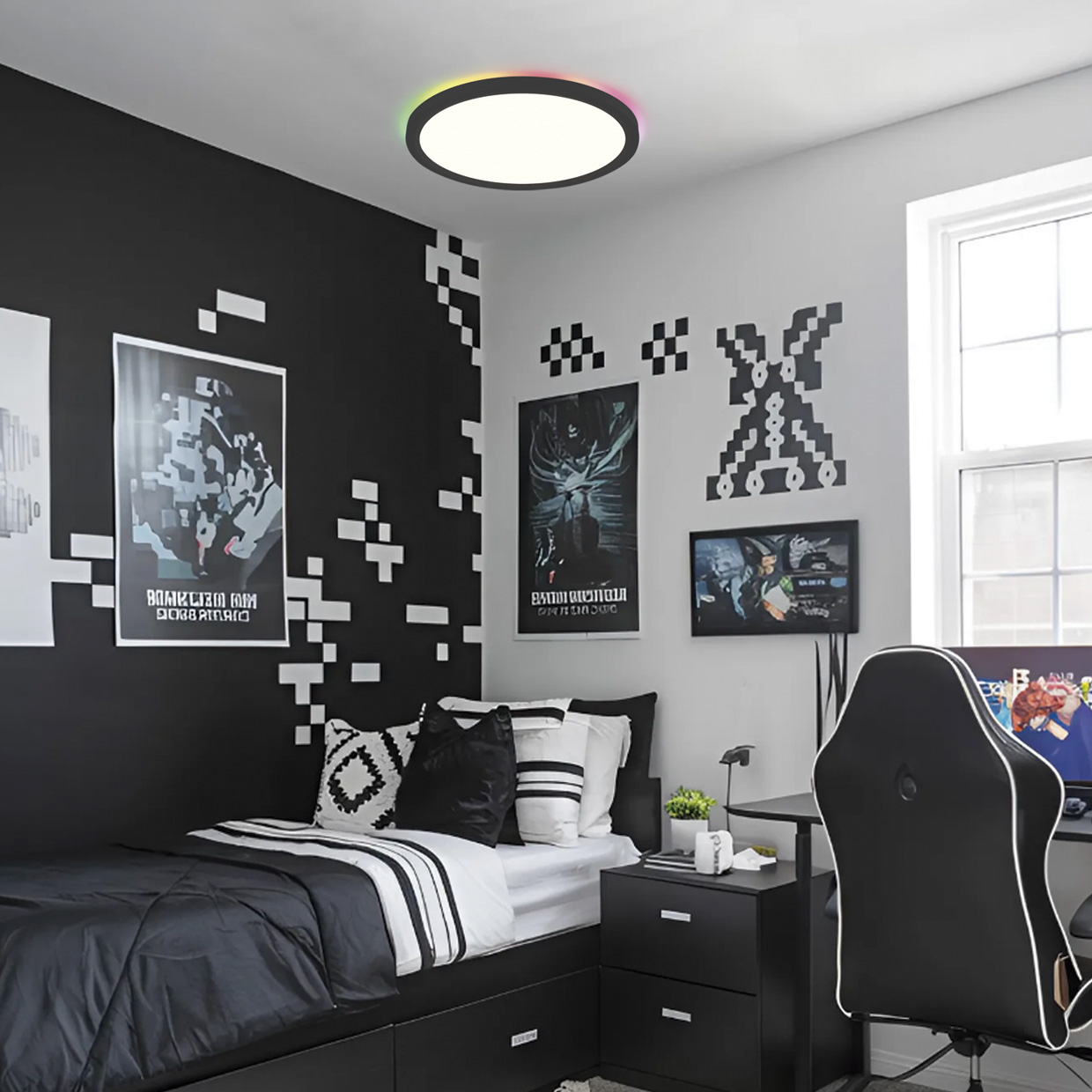 Plafón Led de la Colección TANZA (34W). Fabricado en metal en acabado negro con difusor en metacrilato. Ilumina y decora tus espacios con estilo. Este plafón LED de 34W ofrece cambio de color de Led y función RGB para crear el ambiente perfecto en cu