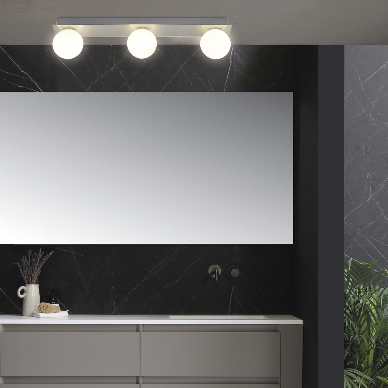 Regleta 3L de la Colección GIO en acabado cromo con tulipa opal. Diseño compacto y minimalista, combinable con el aplique y regleta 2L de su misma familia. Fabricado en metal y cristal. Ideal para instalar en baños gracias a su protección IP44.Usa