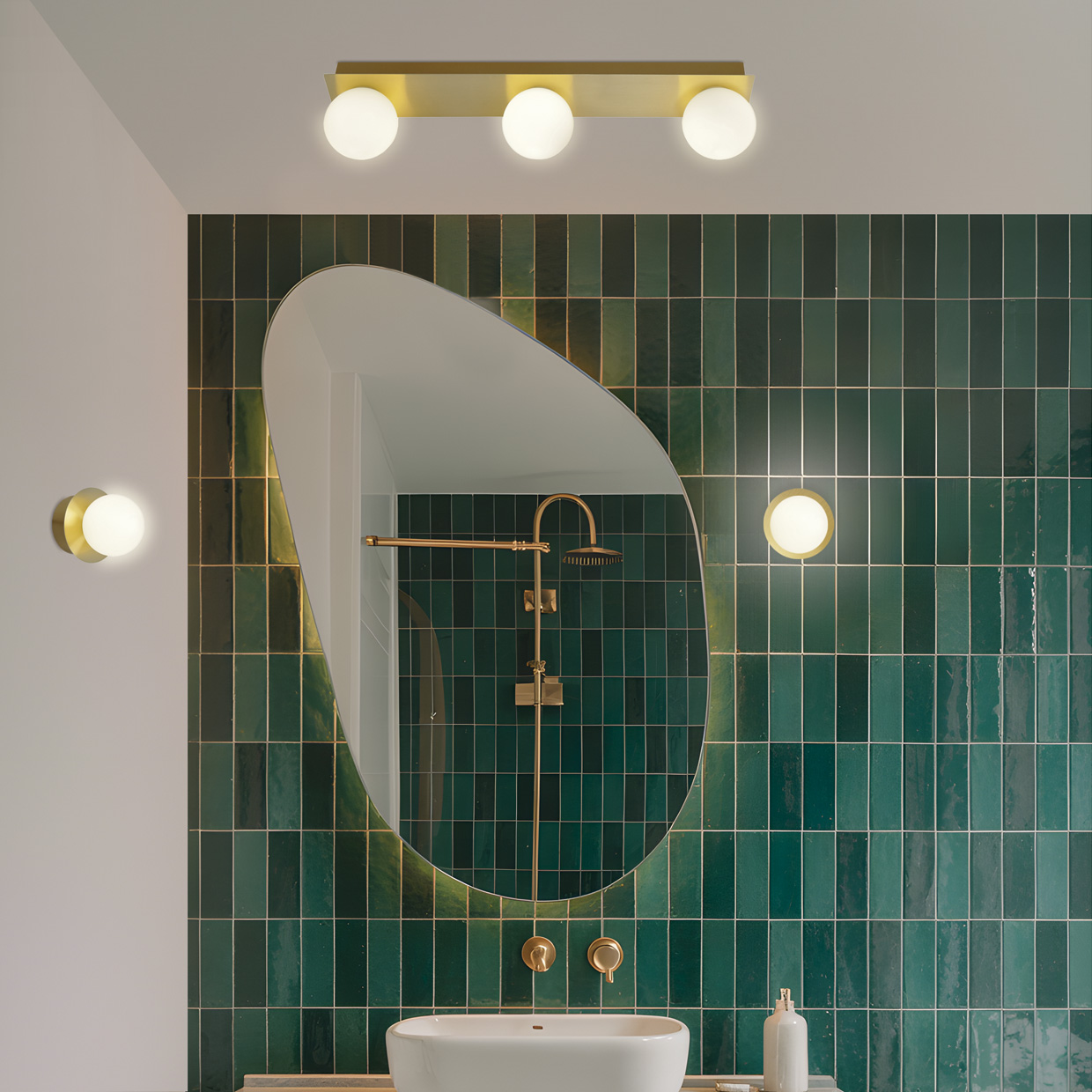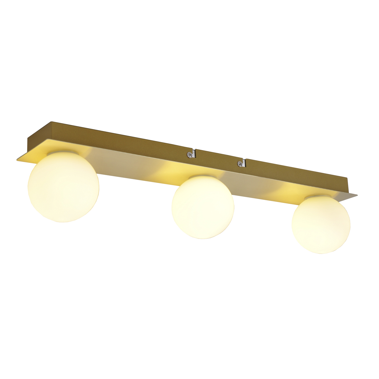 Regleta 3L de la Colección GIO en acabado latón con tulipa opal. Diseño compacto y minimalista. Fabricado en metal y cristal. Ideal para instalar en baños gracias a su protección IP44.Usa bombillas G9 (no incluidas), compatibles con bombillas LED.