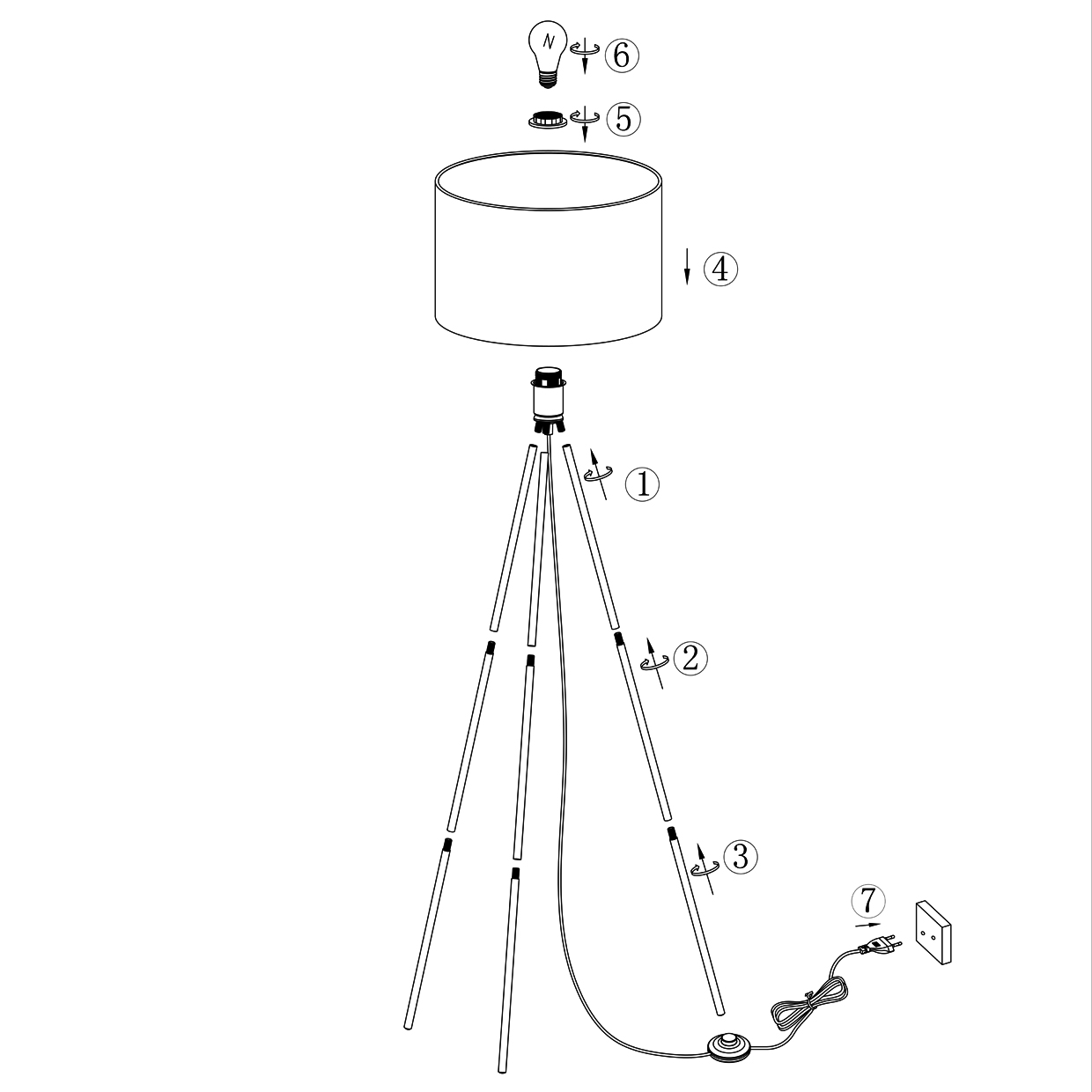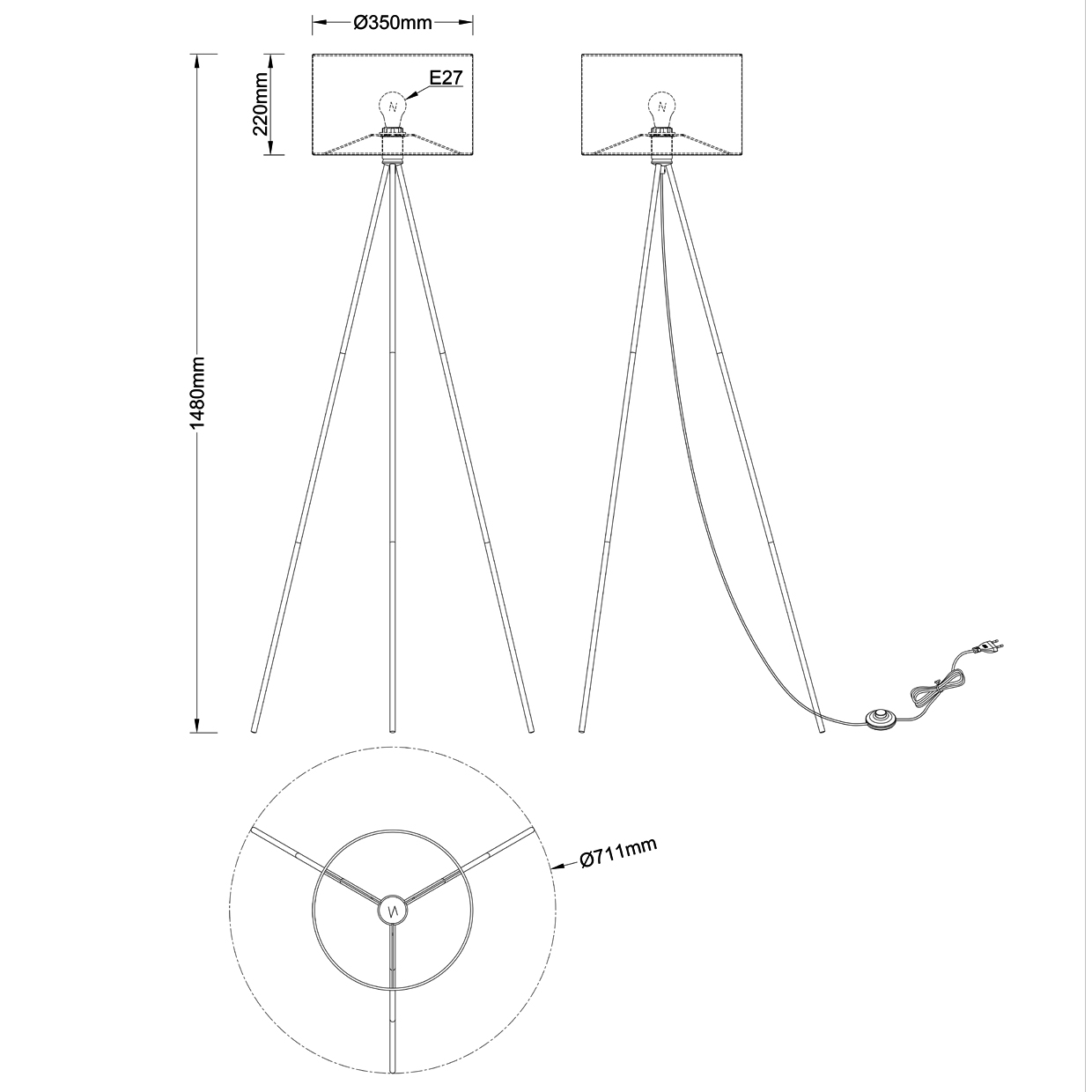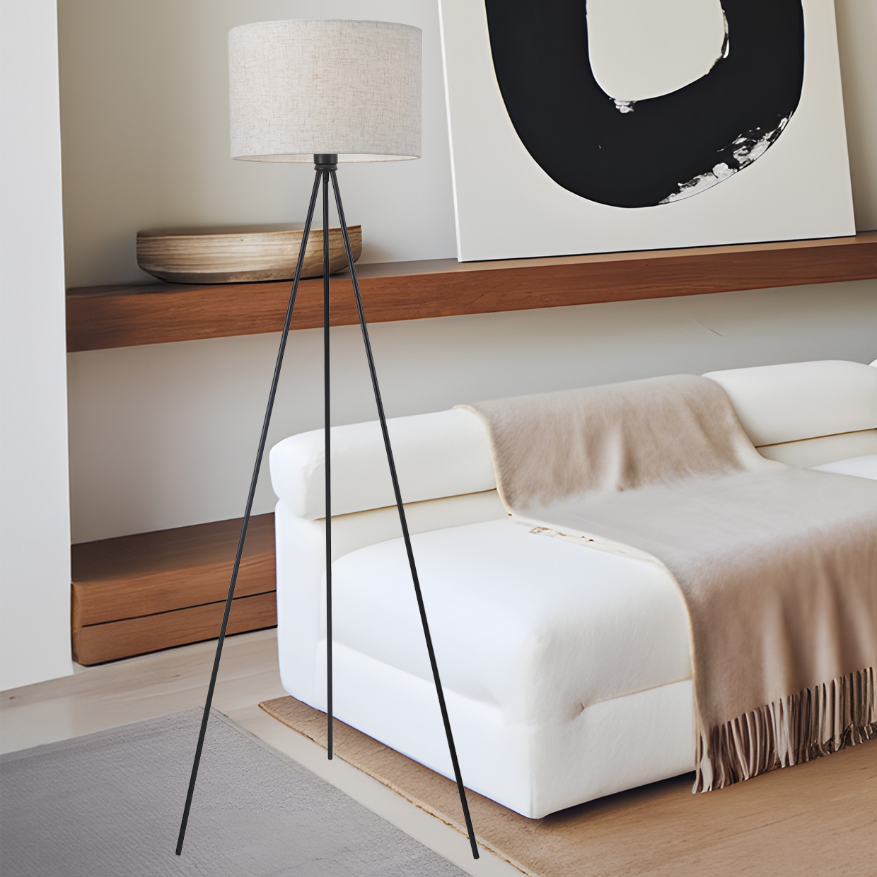 Pie de salón de la Colección TIVOLI, fabricado en metal con acabado negro y pantalla de tela de lino.Espacio entre barras: 35 cm.Cable PVC negro con interruptor de pie, cae desde el portalámparas.