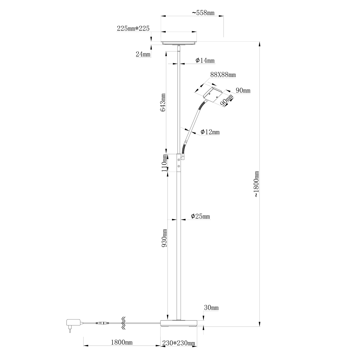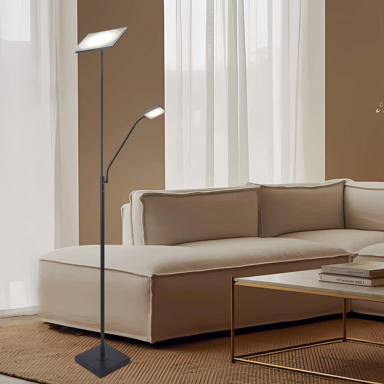 Pie de salón de la Colección LAMBER, fabricado en metal y cristal, acabado negro.Base de Ø23 cm.LED principal 25W + LED de lector 5W 4000K (no reemplazables).Dimable mediante doble interruptor ON/OFF en barra.Orientable.
