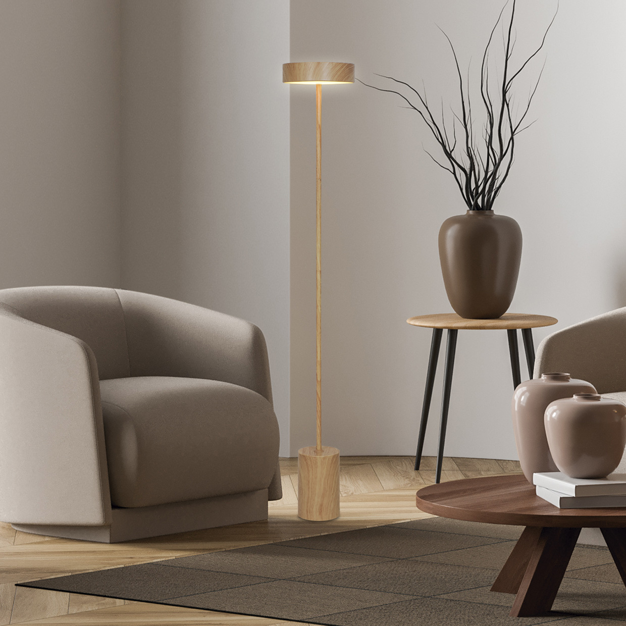 Pie de salon de la Colección FRESNO en acabado Madera clara, fabricado en metal.3 niveles de intensidad de luz.LED 12W 1000LM 4000KCable 1,5m negroInterruptor On/Off en la base.