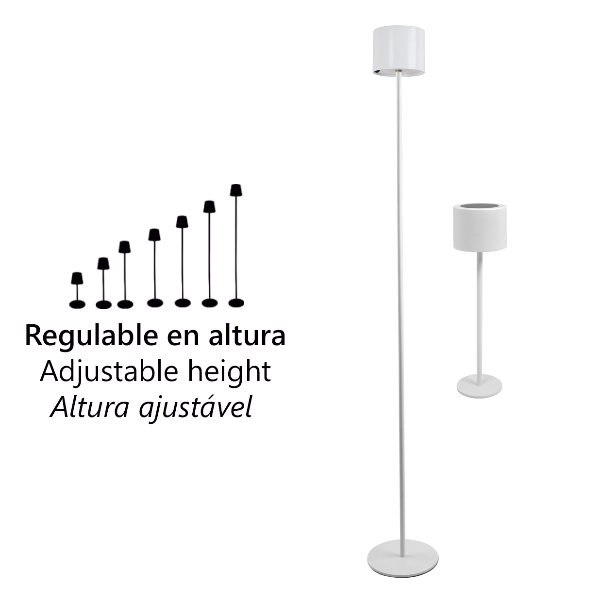 Lámpara solar de la Colección ELISEO, en acabado metal blanco, regulable en altura y versátil, pudiéndose usar como sobremesa o como pie de salón.Bases: 10 cm (sobremesa) / 16 cm (pie de salón)Batería de 2000mAhLED de 5W regulable entre 300