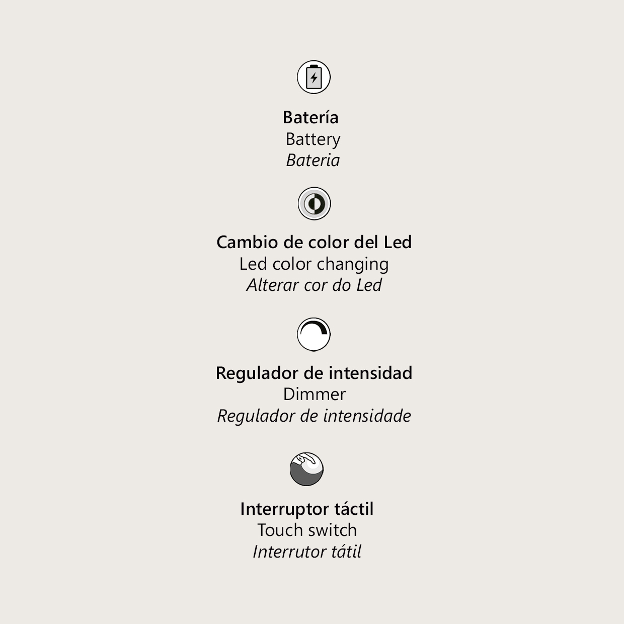 Sobremesa de la Colección HABANA, en acabado blanco. Fabricada en metal con recipiente de cristal.Interruptor táctil3 temperaturas de color: 3000K, 4500K y 6000KBatería de litio recargable integrada de 1800mAhCarga por USB, tiempo de carga: