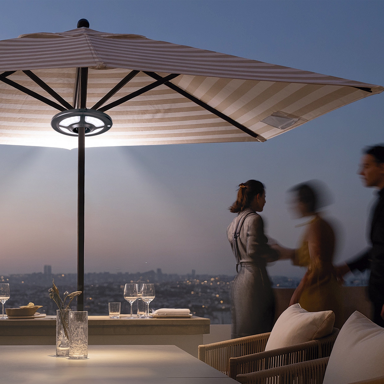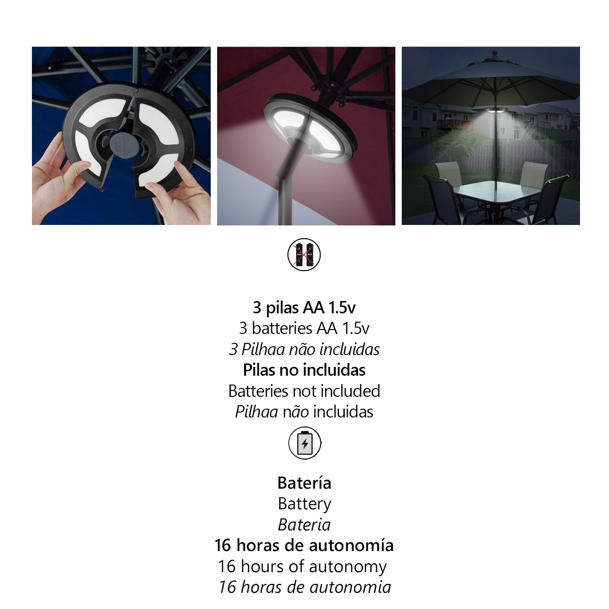 Aro de luz led de la colección LACOS para instalación en sombrillas, en acabado Negro. Fabricado acrílico.LED 3WInterruptol tactil.Temperaturas de color 6000kFunciona con 3 pilas AA 1,5v (no incluidas)Tiempo de iluminación: 4-5 horas con
