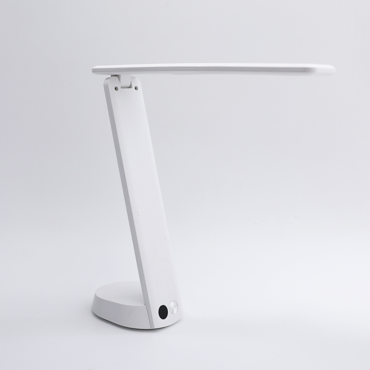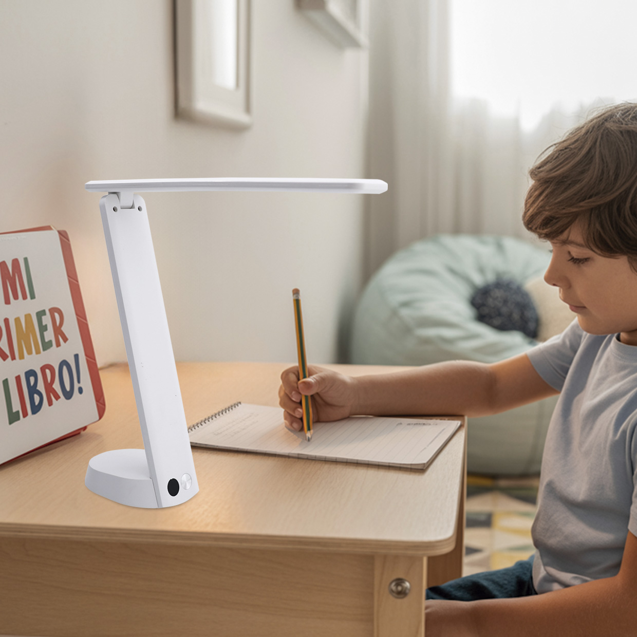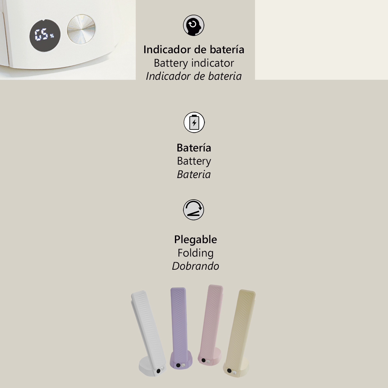 Flexo de la Colección BLUM, fabricado en acrílico con acabado blanca.LED 3W regulable en 3 temperaturas de color: 3000K 4000K 6500K.Batería recargable.Pantalla LCD con indicador de batería.Plegable