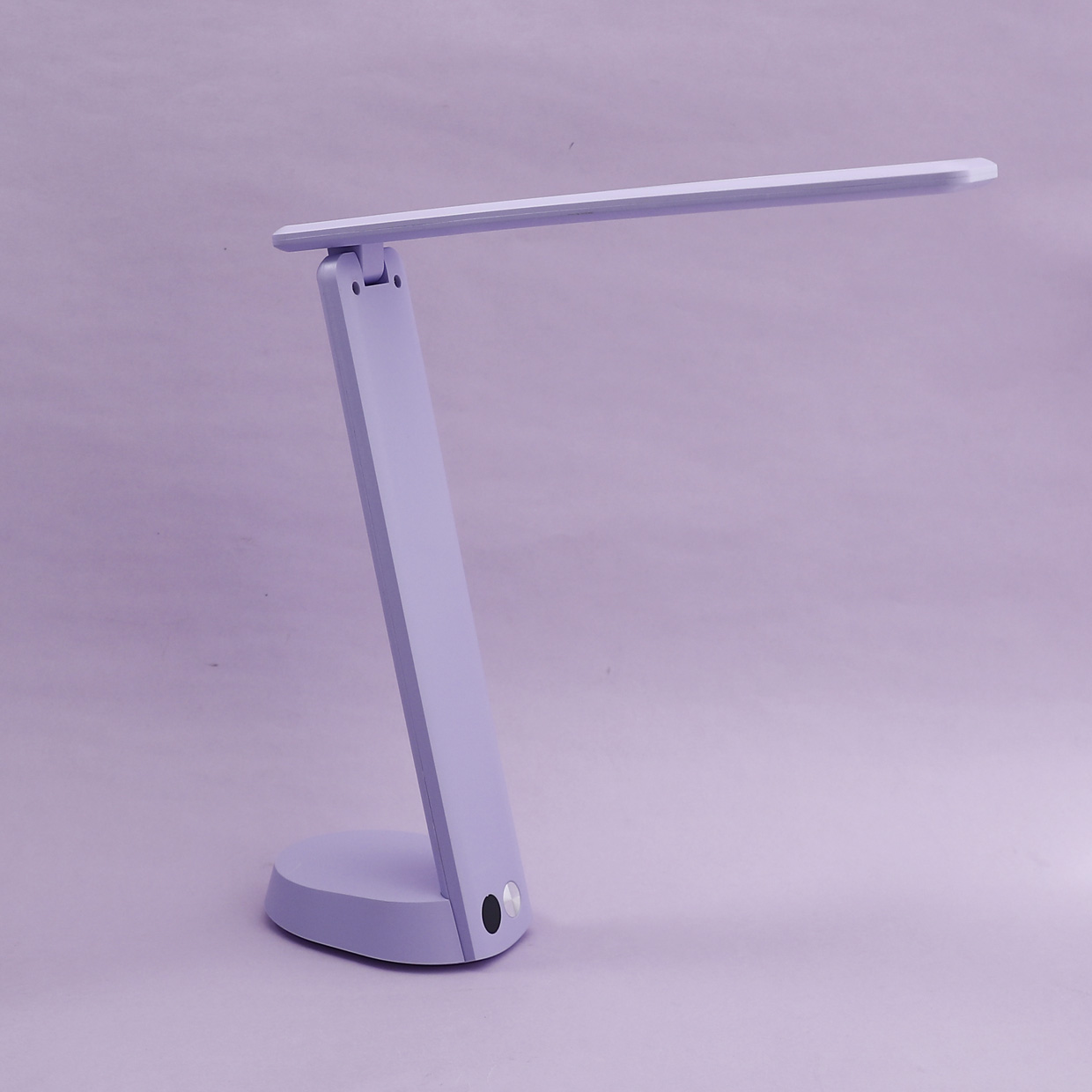 Flexo de la Colección BLUM, fabricado en acrílico con acabado en Lila.LED 3W regulable en 3 temperaturas de color: 3000K 4000K 6500K.Batería recargable.Pantalla LCD con indicador de batería.Plegable