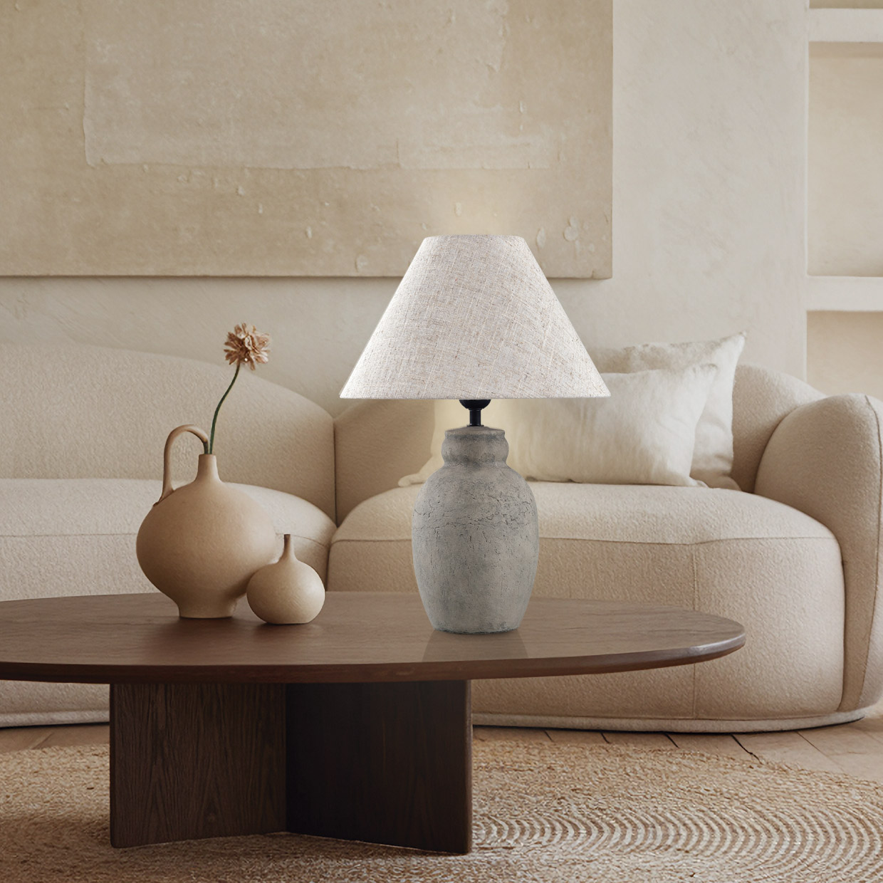 Sobremesa de la Colección TERRA acabado en ceramica Gris, con pantalla cónica de tela de Ø30 cm.1 x E-27 / 60W (no incluida), compatible con bombillas LED.Cable PVC con interruptor ON/OFF.
