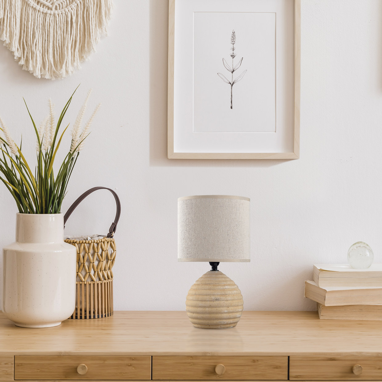 Sobremesa de la Colección CLÓ en acabado ceramica Marrón, con pantalla de tela de Ø16 cm.1 x E-14 / 40W (no incluida), compatible con bombillas LED.Cable PVC con interruptor ON/OFF.