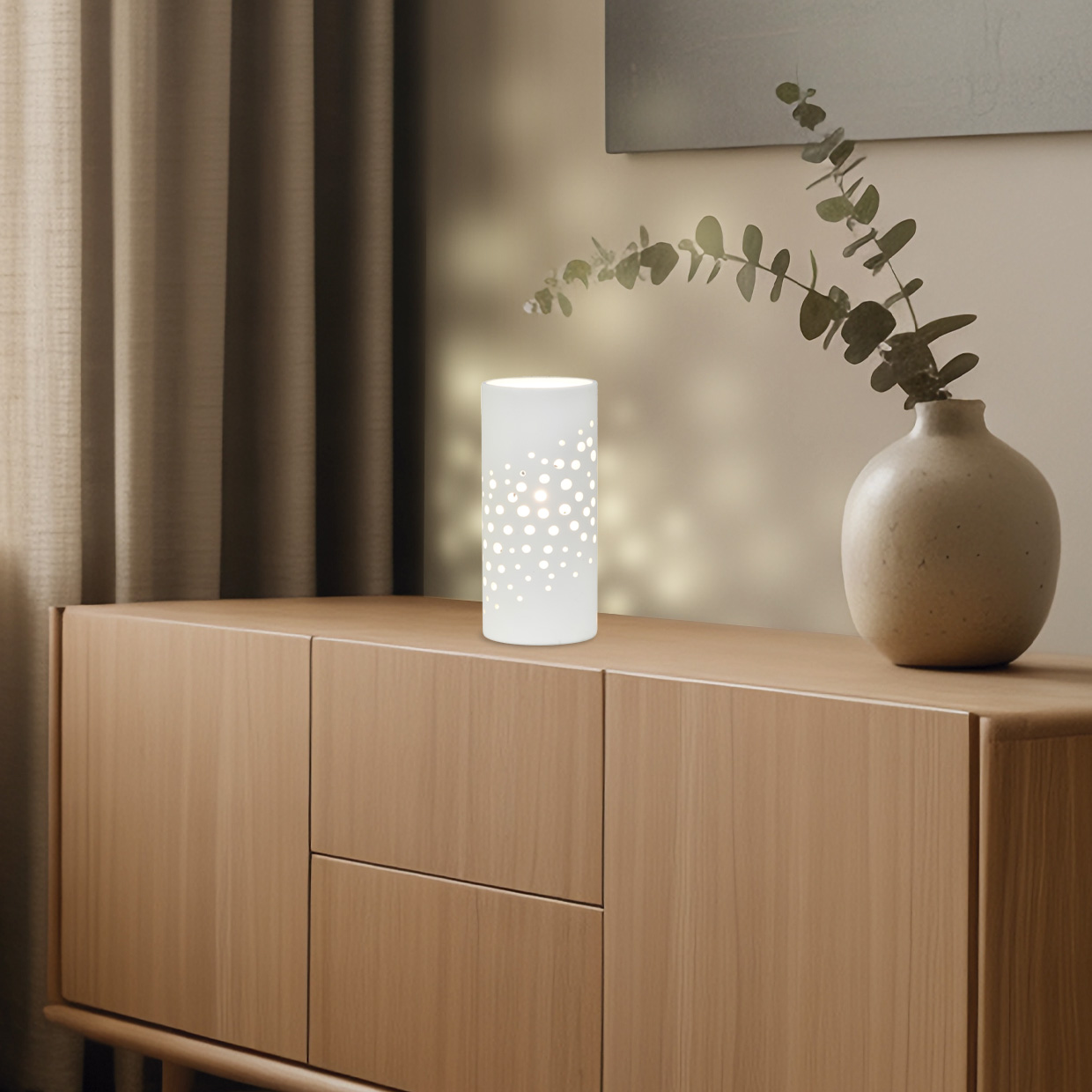 Sobremesa de la Colección LAVA en acabado cerámica Blanca.1 x E-14 / 40W (no incluida), compatible con bombillas LED.Cable PVC negro de 1,5 m con interruptor ON/OFF.