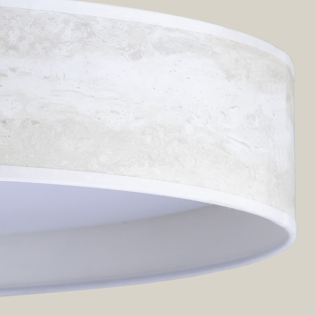 Plafón de la Colección Mera. Artículo de fabricación propia, hecho metal, acrílico y pantalla de tela cilíndrica apaisada en efecto Mármol. Disponible en 10 acabados diferentes lo que la convierte en una pieza muy versatil ideal para adaptarse a dist