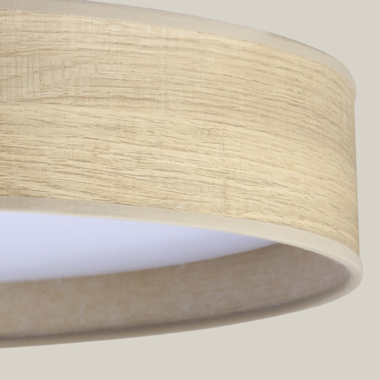 Plafón de la Colección Mera. Artículo de fabricación propia, hecho metal, acrílico y pantalla de tela cilíndrica apaisada en efecto Madera. Disponible en 10 acabados diferentes lo que la convierte en una pieza muy versatil ideal para adaptarse a dist