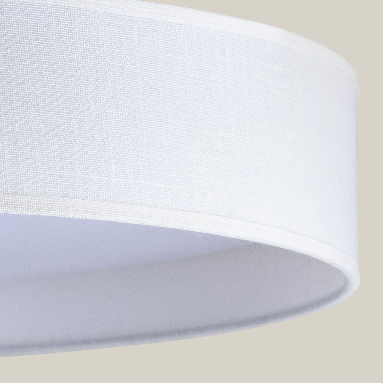 Plafón de la Colección Mera. Artículo de fabricación propia, hecho metal, acrílico y pantalla de tela cilíndrica apaisada en Lino marfil. Disponible en 10 acabados diferentes lo que la convierte en una pieza muy versatil ideal para adaptarse a distin