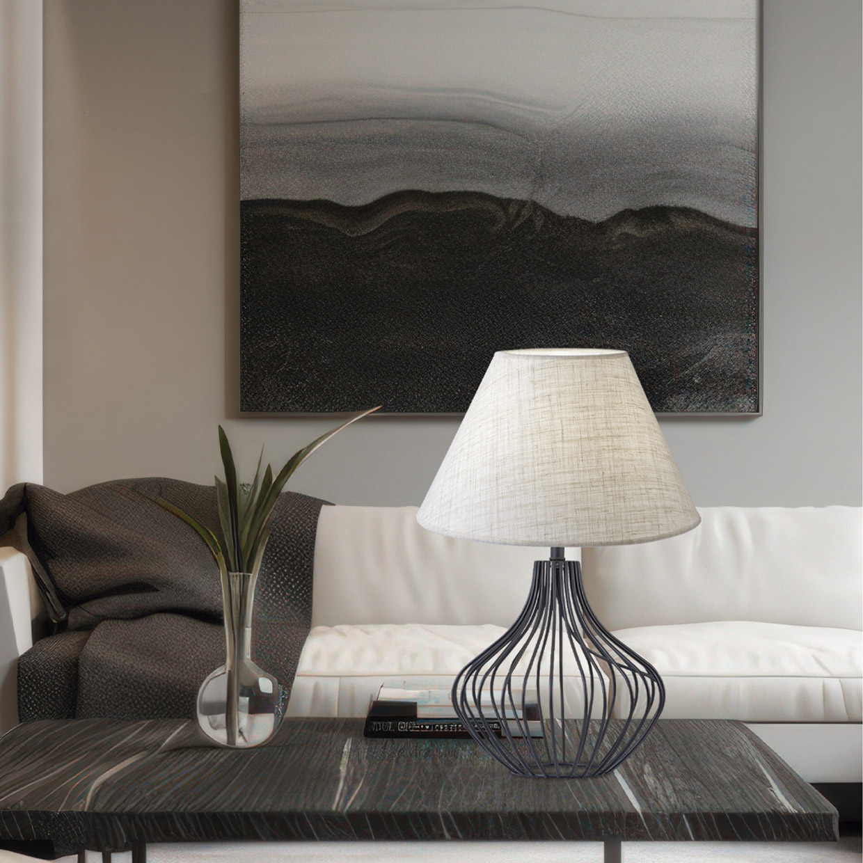 Sobremesa de la Colección PRISON en metal con acabado negro y pantalla textil de fabricación propia. Su estructura de varillas aporta un diseño elegante y distintivo.Base de Ø11 cm.Pantalla acabada en lino tostado de Ø35 cm.1 x E-27 / 60W máx.