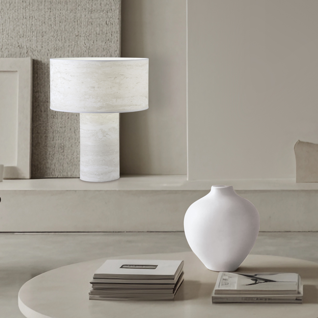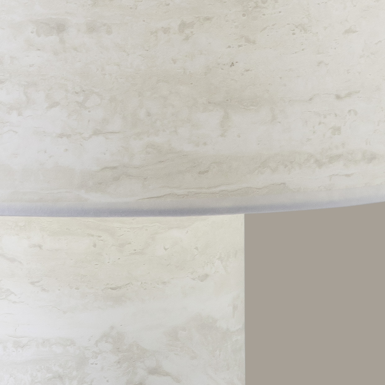 Sobremesa de la Colección BRANDY, de fabricación propia, elaborada con especial cuidado en los detalles, combinando metal negro y tela con un acabado artesanal.Pantalla de tela en acabado marmolizado de Ø30 cm.Base cilíndrica de tela en acabado m