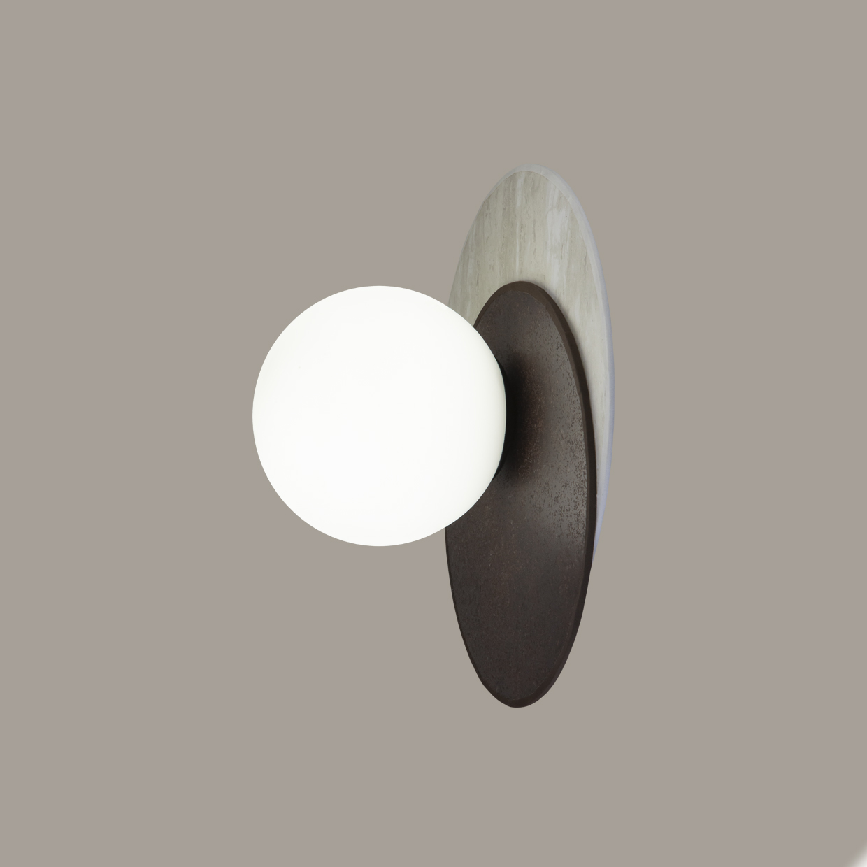 Plafón/aplique de la Colección Wanda. Artículo de fabricación propia, hecho en metal, tela en efecto Óxido y efecto Mármol y tulipa cristal opal.Usa bombillas E-27, compatibles con tecnología Led (no incluidas) 1 x E-27, 60W Max.Dimensiones: 33×3