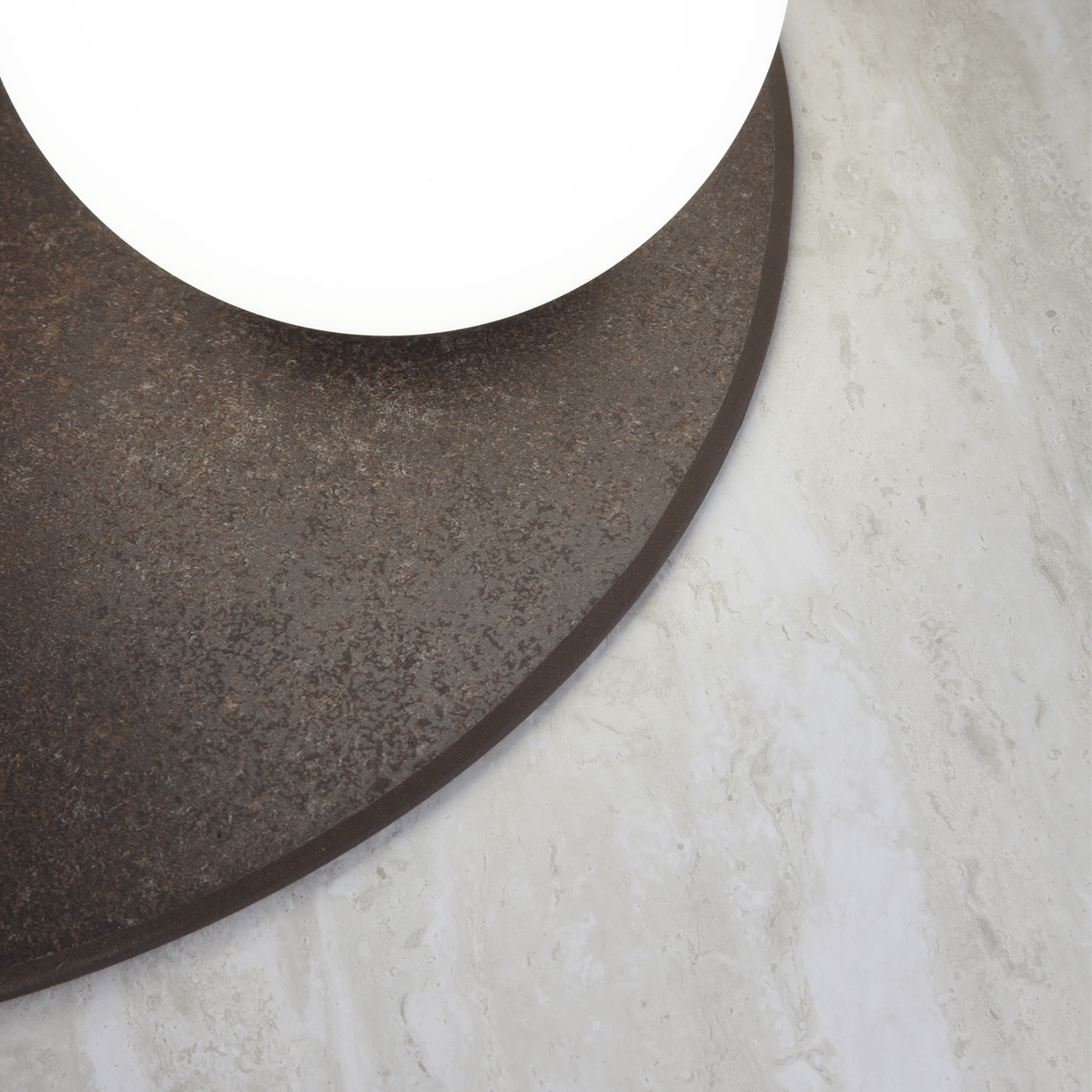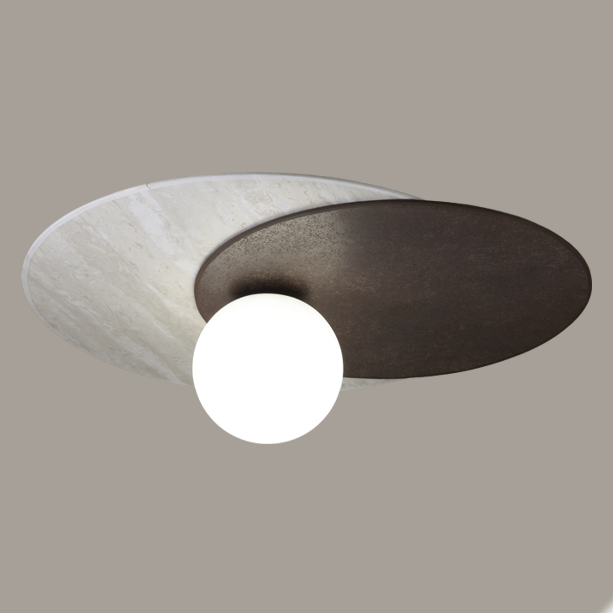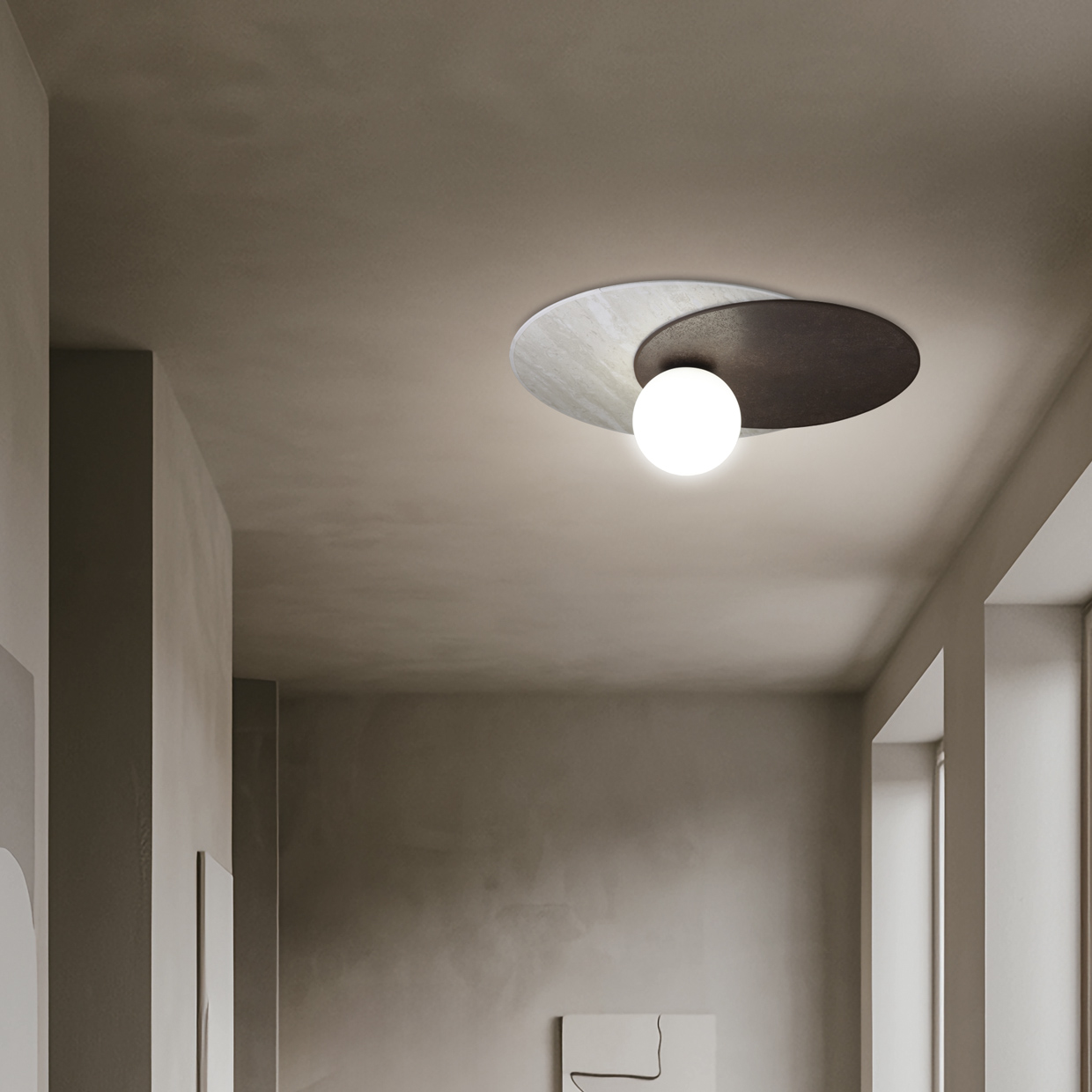 Plafón/aplique de la Colección Wanda. Artículo de fabricación propia, hecho en metal, tela en efecto Óxido y efecto Mármol y tulipa cristal opal.Usa bombillas E-27, compatibles con tecnología Led (no incluidas) 1 x E-27, 60W Max.Dimensiones: 56×5
